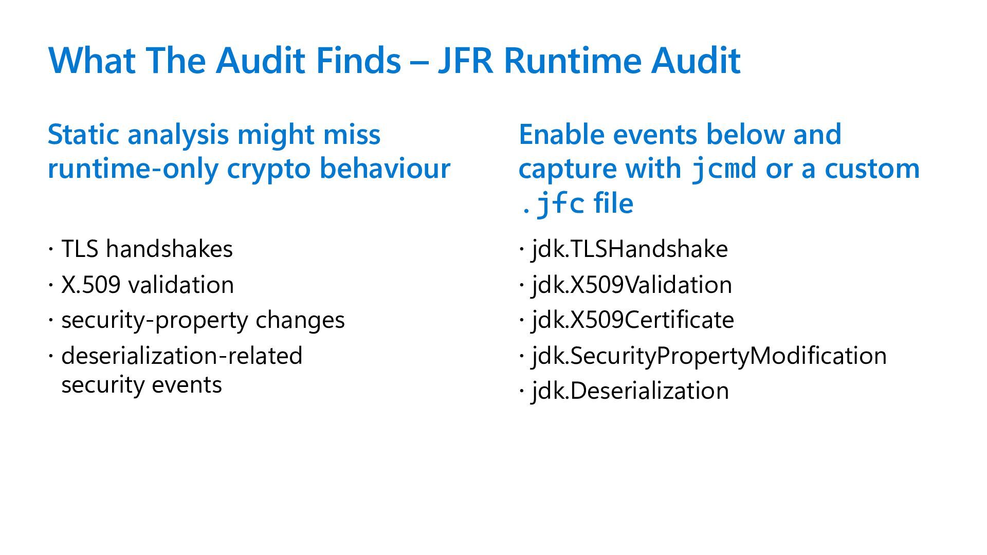 might miss runtime-only crypto behaviour ž TLS handshakes ž X.509 validation ž security-property changes ž deserialization-related security events Enable events below and capture with jcmd or a custom .jfc file ž jdk.TLSHandshake ž jdk.X509Validation ž jdk.X509Certificate ž jdk.SecurityPropertyModification ž jdk.Deserialization