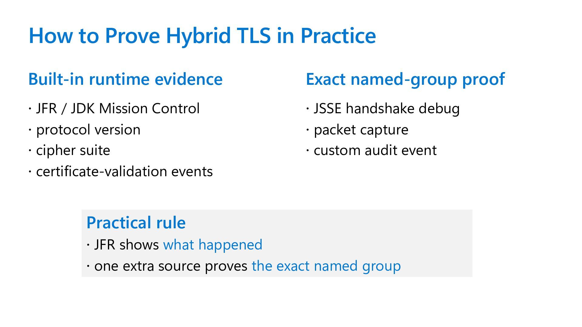 ž JFR / JDK Mission Control ž protocol version ž cipher suite ž certificate-validation events Exact named-group proof ž JSSE handshake debug ž packet capture ž custom audit event Practical rule ž JFR shows what happened ž one extra source proves the exact named group