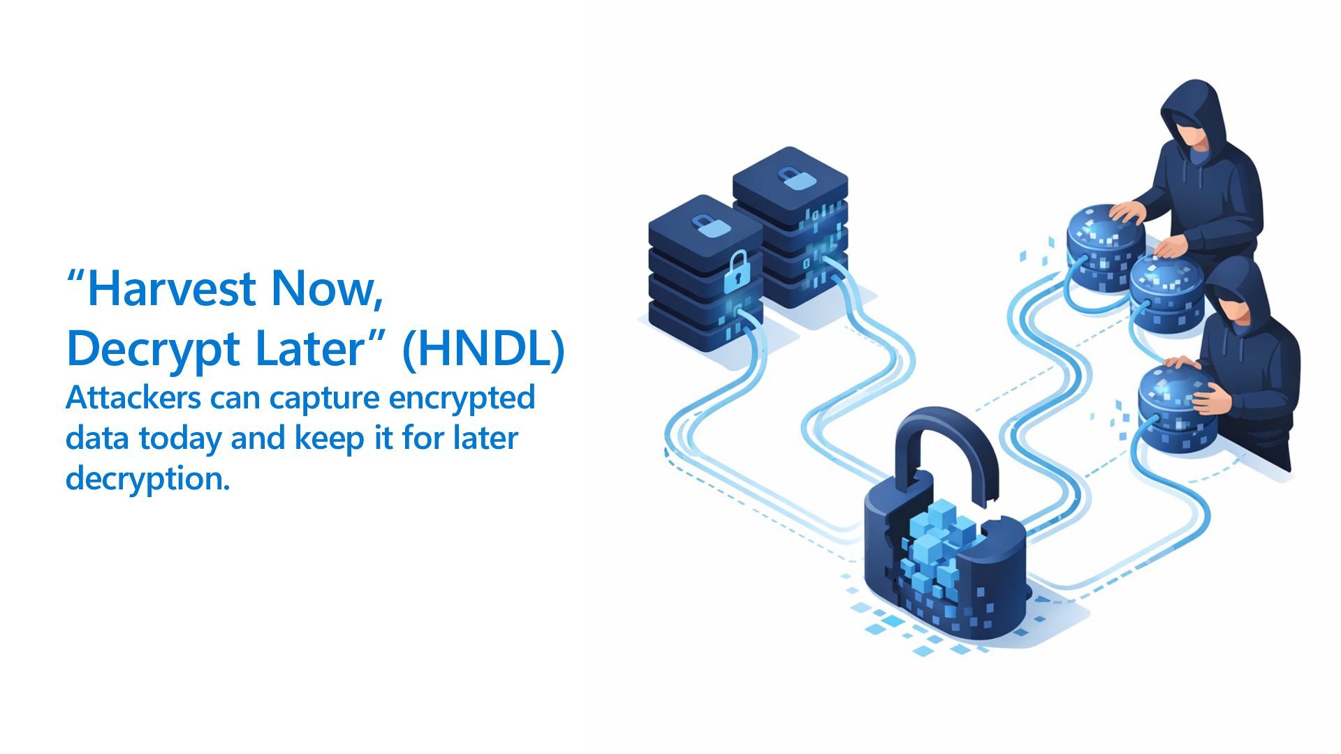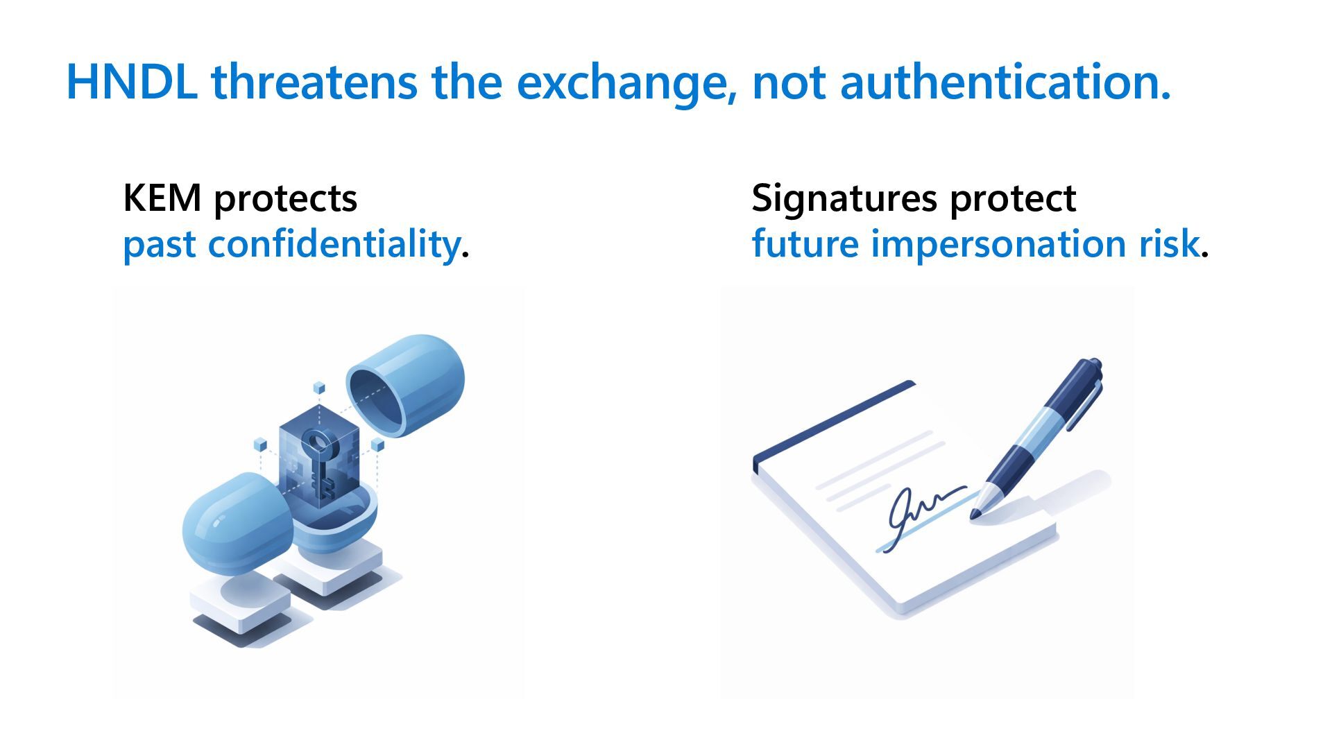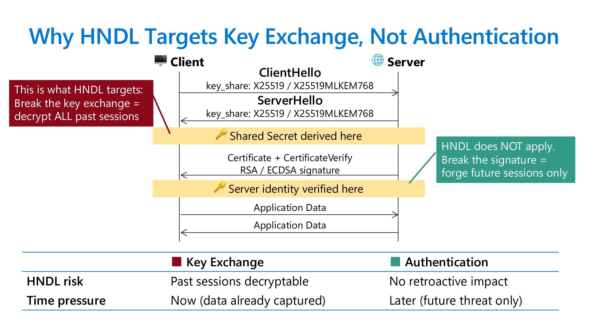 / X25519MLKEM768 🔑 Shared Secret derived here 🖥 Client 🌐 Server Application Data Application Data ServerHello key_share: X25519 / X25519MLKEM768 Certificate + CertificateVerify RSA / ECDSA signature 🔑 Server identity verified here This is what HNDL targets: Break the key exchange = decrypt ALL past sessions HNDL does NOT apply. Break the signature = forge future sessions only ▪ Key Exchange ▪ Authentication HNDL risk Past sessions decryptable No retroactive impact Time pressure Now (data already captured) Later (future threat only)