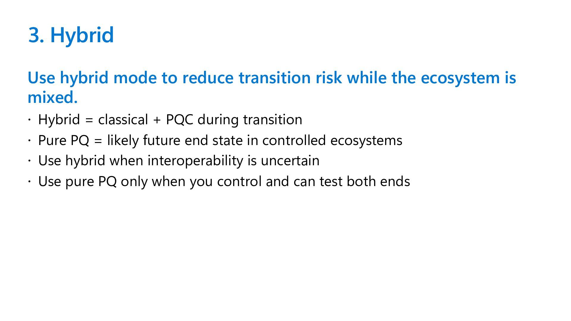 the ecosystem is mixed. ž Hybrid = classical + PQC during transition ž Pure PQ = likely future end state in controlled ecosystems ž Use hybrid when interoperability is uncertain ž Use pure PQ only when you control and can test both ends