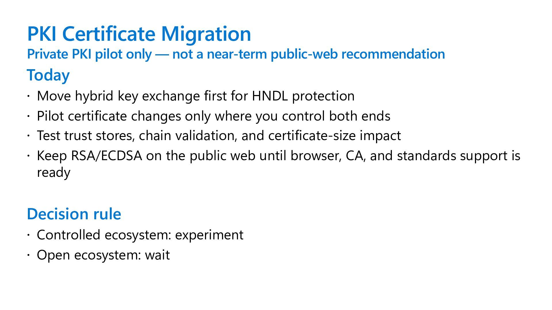 near-term public-web recommendation Today ž Move hybrid key exchange first for HNDL protection ž Pilot certificate changes only where you control both ends ž Test trust stores, chain validation, and certificate-size impact ž Keep RSA/ECDSA on the public web until browser, CA, and standards support is ready Decision rule ž Controlled ecosystem: experiment ž Open ecosystem: wait