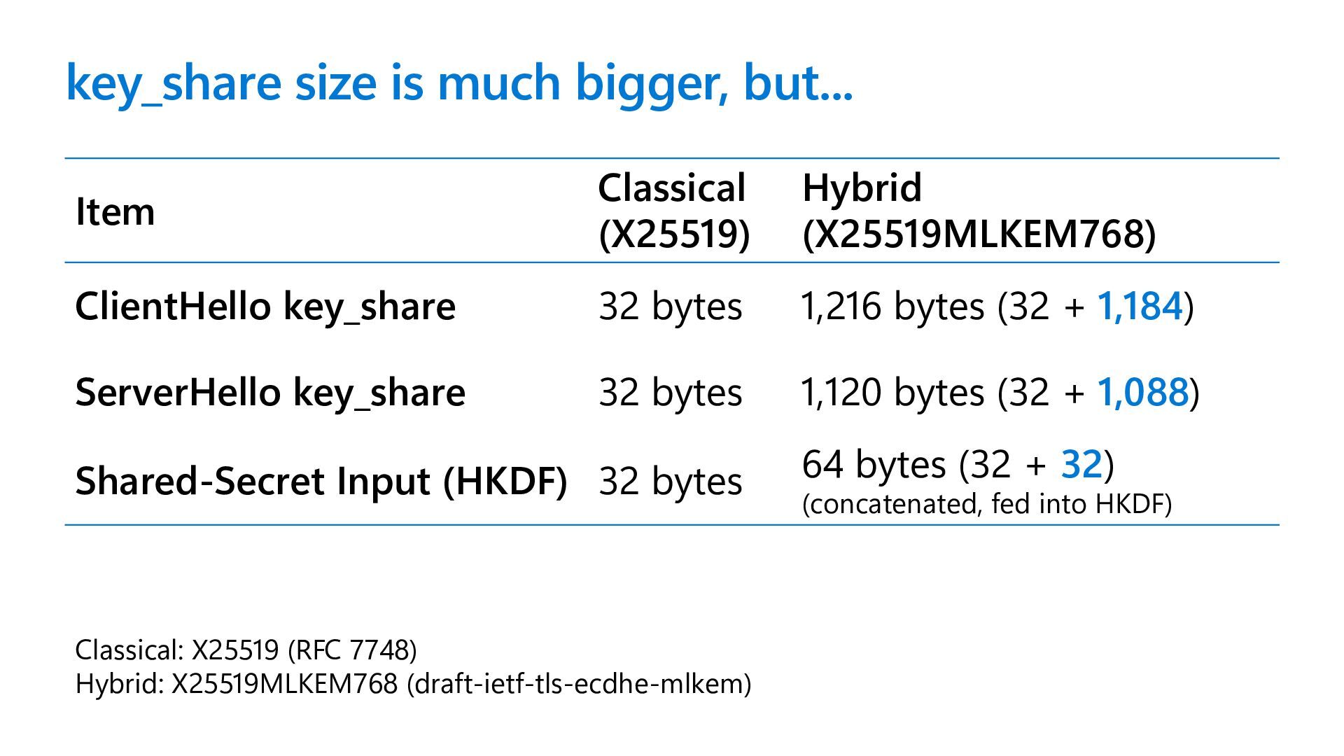 (X25519MLKEM768) ClientHello key_share 32 bytes 1,216 bytes (32 + 1,184) ServerHello key_share 32 bytes 1,120 bytes (32 + 1,088) Shared-Secret Input (HKDF) 32 bytes 64 bytes (32 + 32) (concatenated, fed into HKDF) Classical: X25519 (RFC 7748) Hybrid: X25519MLKEM768 (draft-ietf-tls-ecdhe-mlkem)