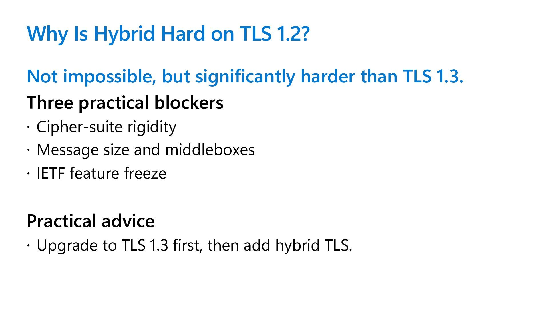 significantly harder than TLS 1.3. Three practical blockers ž Cipher-suite rigidity ž Message size and middleboxes ž IETF feature freeze Practical advice ž Upgrade to TLS 1.3 first, then add hybrid TLS.
