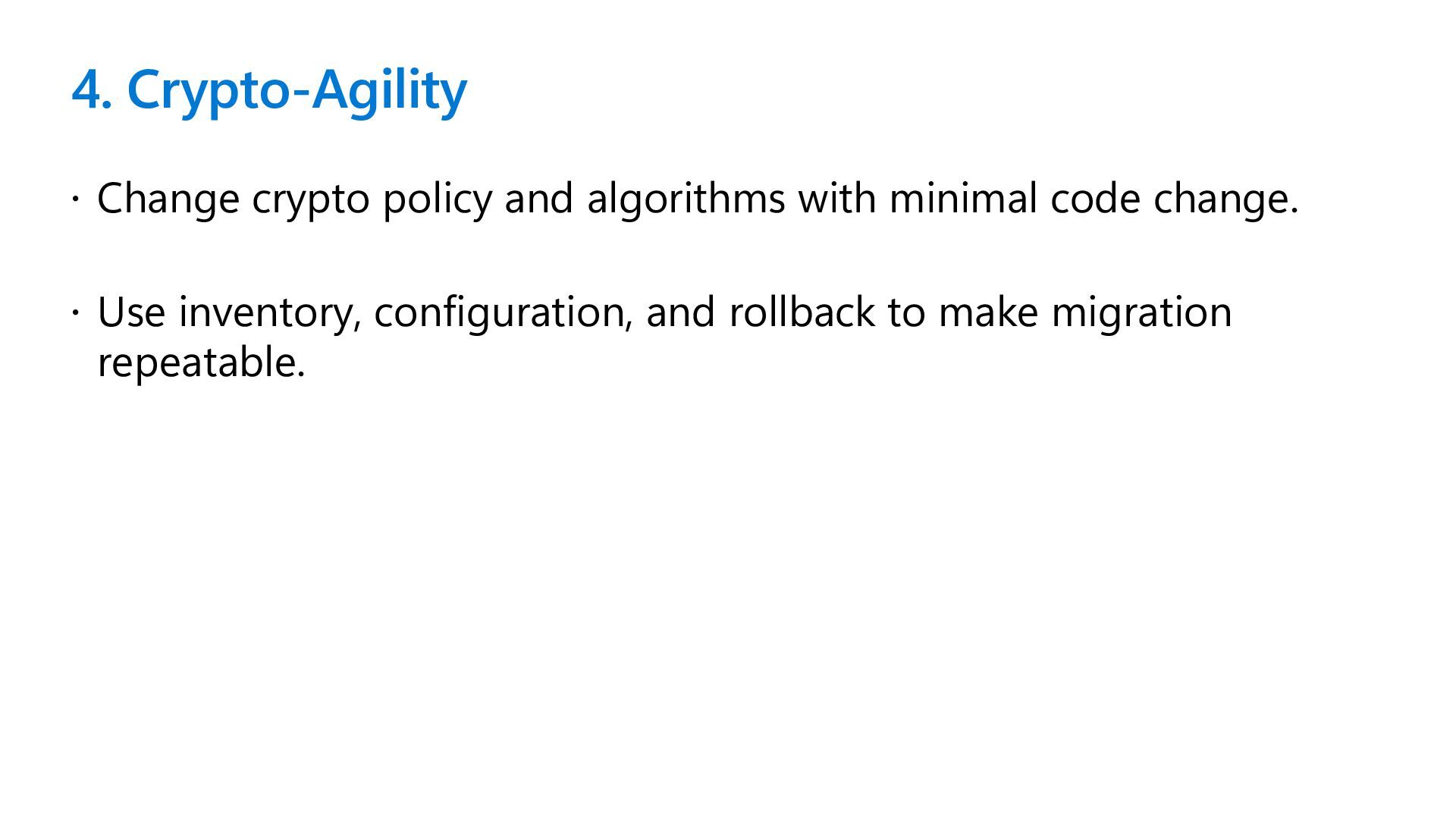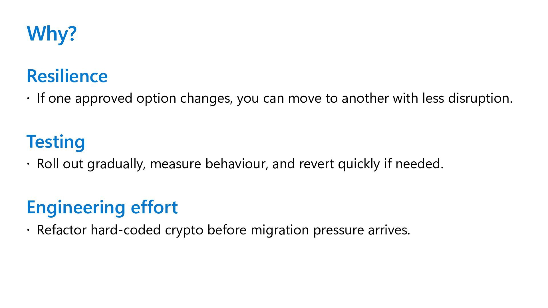 move to another with less disruption. Testing ž Roll out gradually, measure behaviour, and revert quickly if needed. Engineering effort ž Refactor hard-coded crypto before migration pressure arrives.