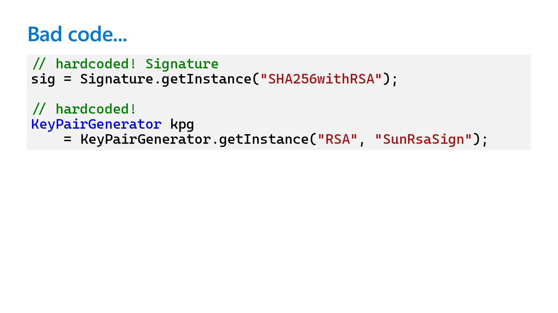 37. Bad code... //" hardcoded! Signature sig = Signature.getInstance("SHA256withRSA"); //" hardcoded!