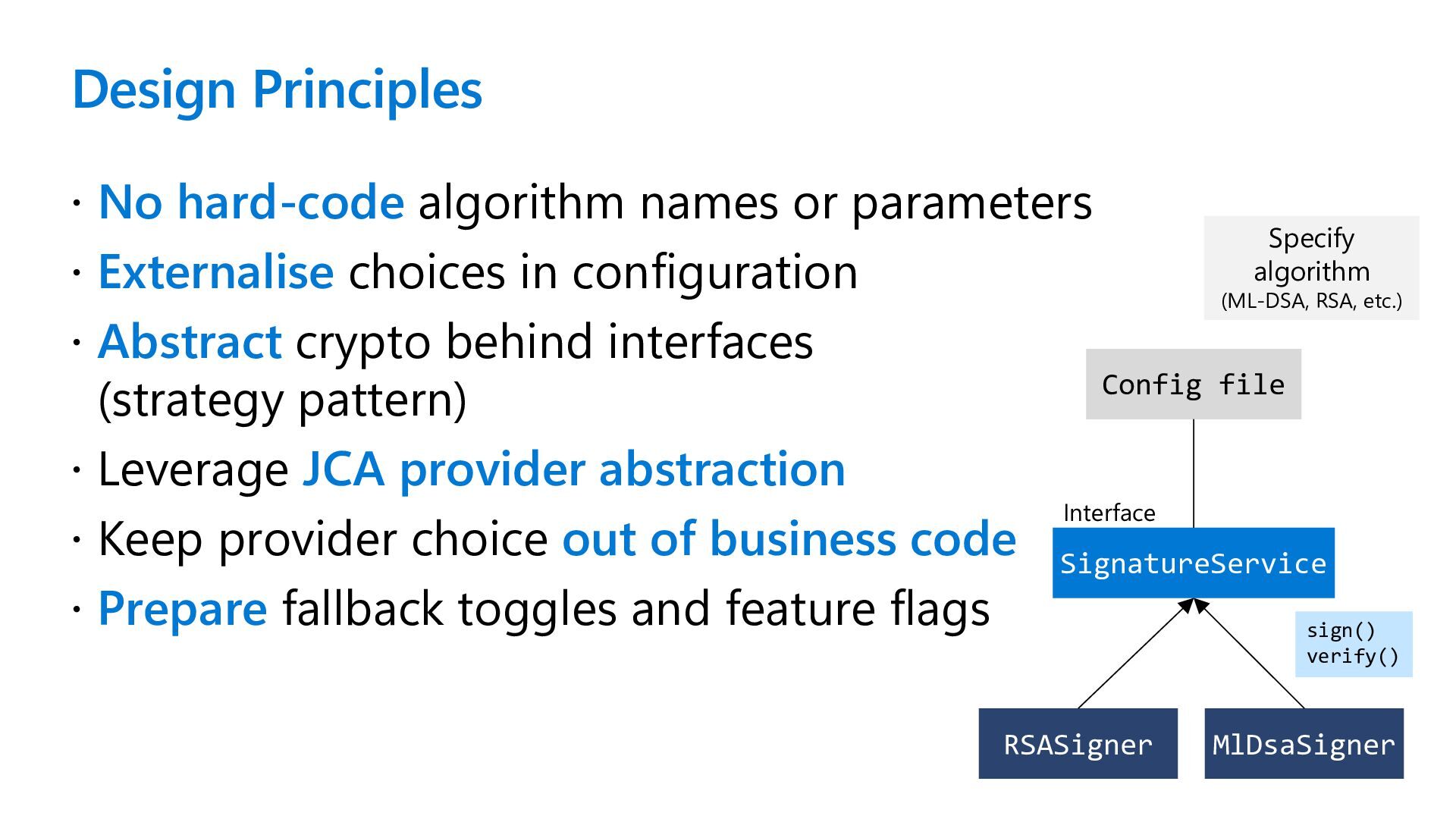 Externalise choices in configuration ž Abstract crypto behind interfaces (strategy pattern) ž Leverage JCA provider abstraction ž Keep provider choice out of business code ž Prepare fallback toggles and feature flags Config file SignatureService RSASigner Specify algorithm (ML-DSA, RSA, etc.) sign() verify() MlDsaSigner Interface