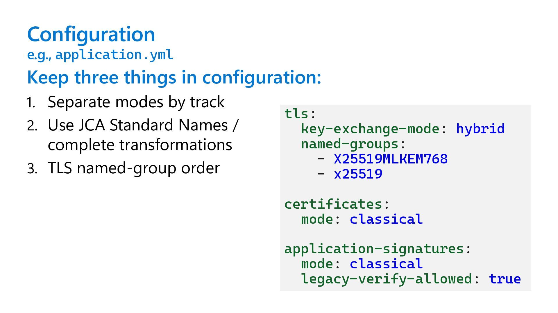 modes by track 2. Use JCA Standard Names / complete transformations 3. TLS named-group order tls: key-exchange-mode: hybrid named-groups: - X25519MLKEM768 - x25519 certificates: mode: classical application-signatures: mode: classical legacy-verify-allowed: true