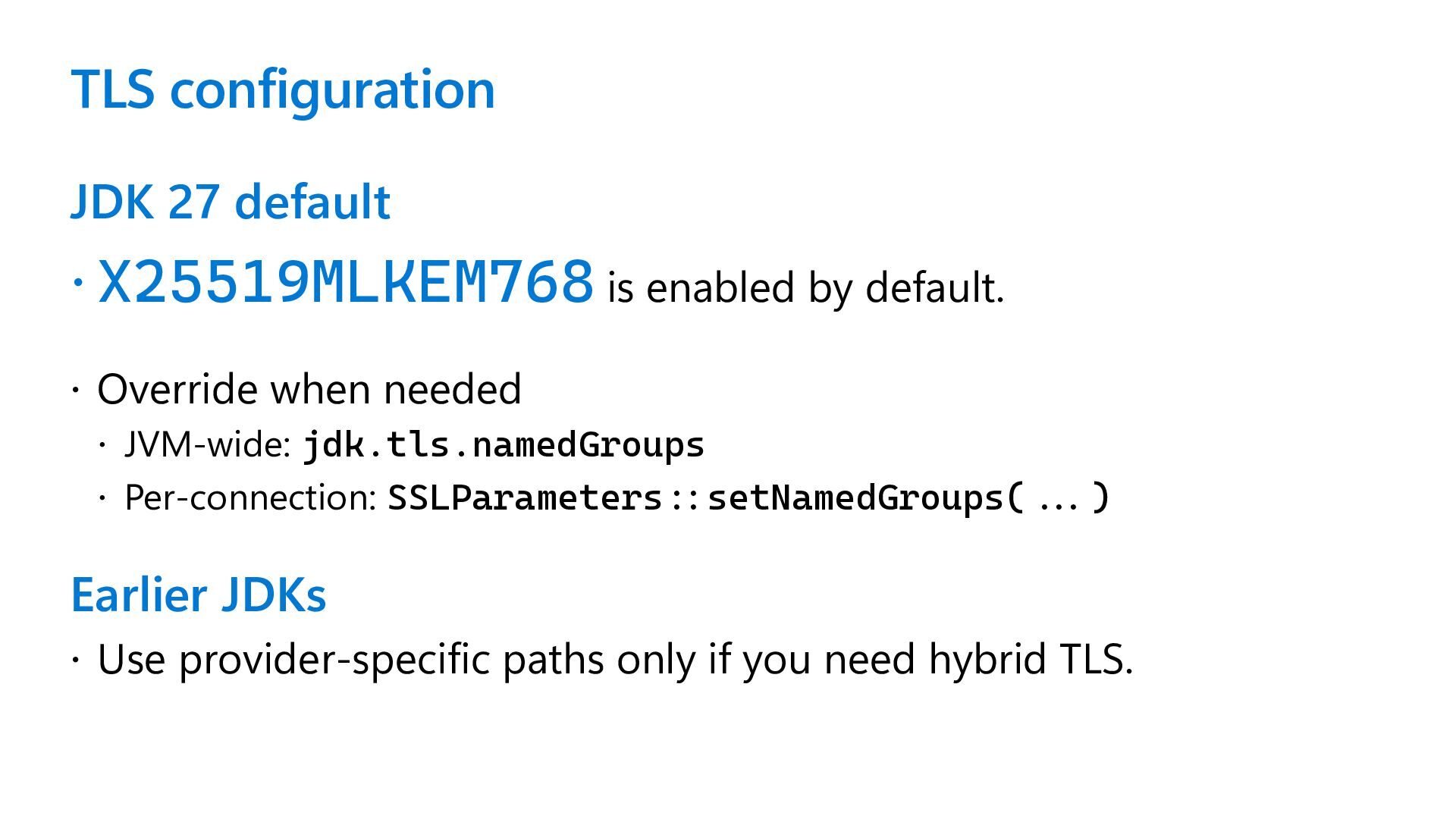 default. ž Override when needed ž JVM-wide: jdk.tls.namedGroups ž Per-connection: SSLParameters::"setNamedGroups(..."") Earlier JDKs ž Use provider-specific paths only if you need hybrid TLS.