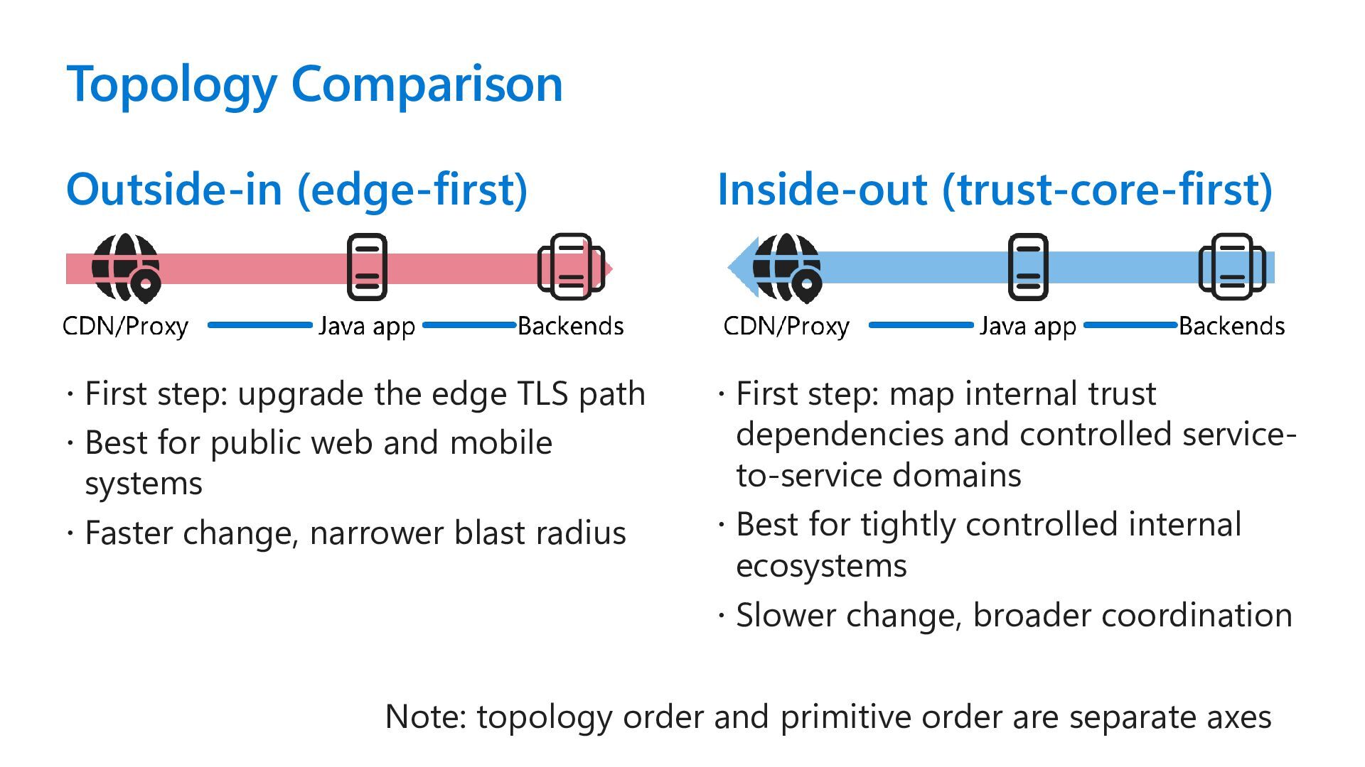 TLS path ž Best for public web and mobile systems ž Faster change, narrower blast radius Inside-out (trust-core-first) ž First step: map internal trust dependencies and controlled service- to-service domains ž Best for tightly controlled internal ecosystems ž Slower change, broader coordination Note: topology order and primitive order are separate axes