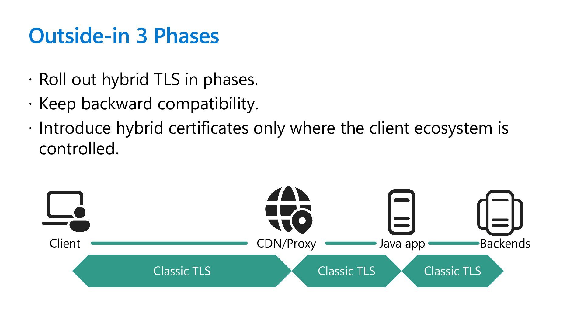 Roll out hybrid TLS in phases. ž Keep backward compatibility. ž Introduce hybrid certificates only where the client ecosystem is controlled. Backends Java app CDN/Proxy Client Classic TLS Classic TLS Classic TLS