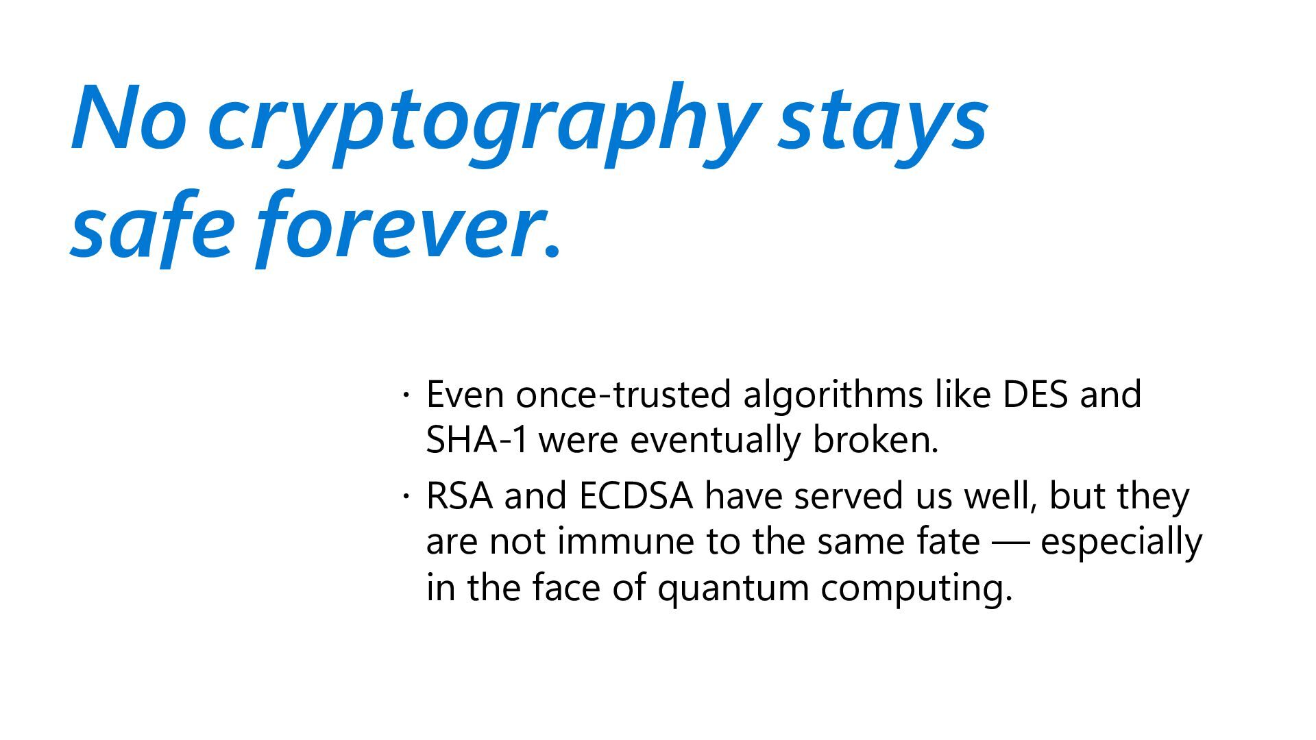 DES and SHA-1 were eventually broken. ž RSA and ECDSA have served us well, but they are not immune to the same fate — especially in the face of quantum computing.