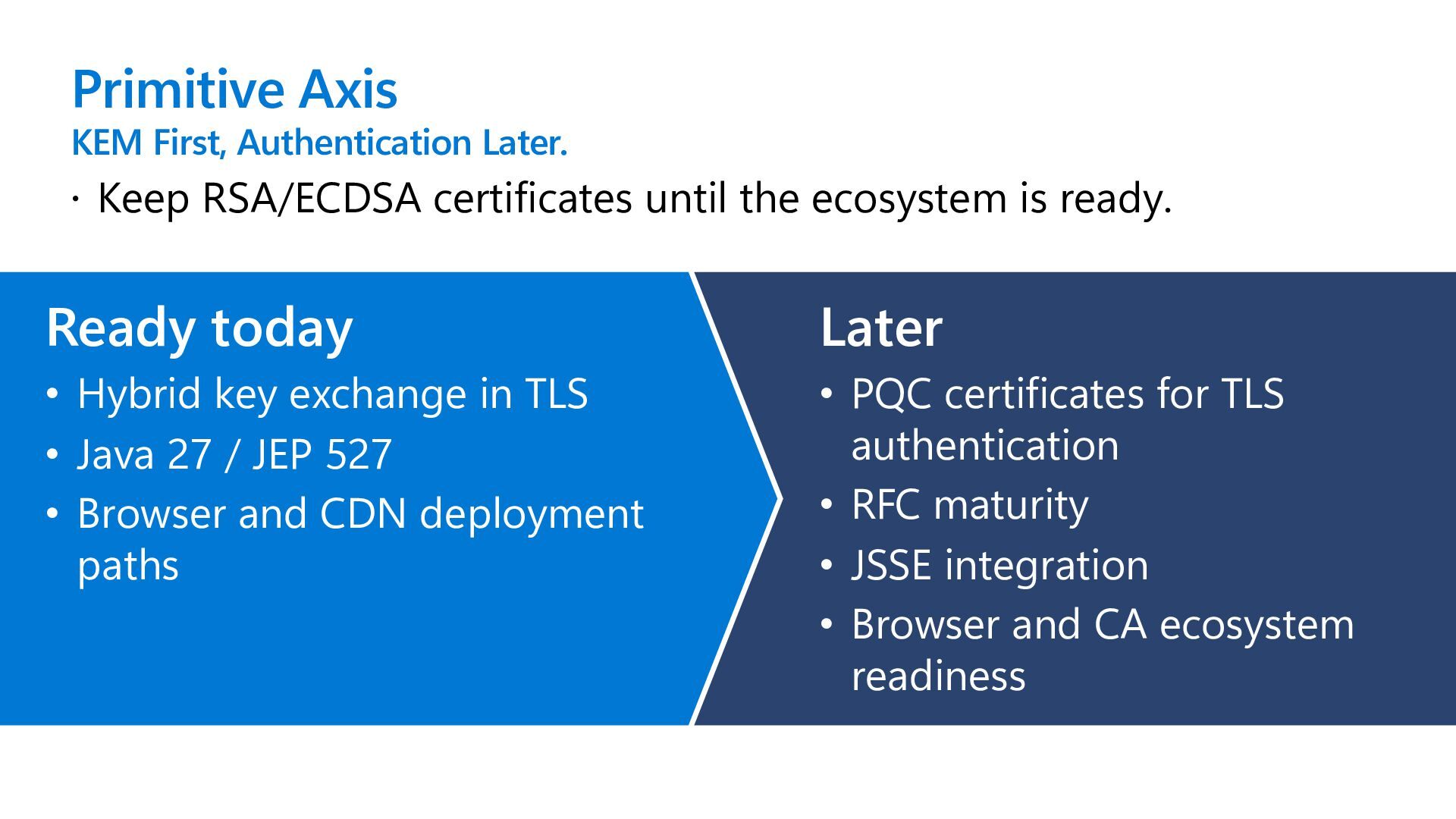 key exchange in TLS • Java 27 / JEP 527 • Browser and CDN deployment paths Later • PQC certificates for TLS authentication • RFC maturity • JSSE integration • Browser and CA ecosystem readiness ž Keep RSA/ECDSA certificates until the ecosystem is ready.