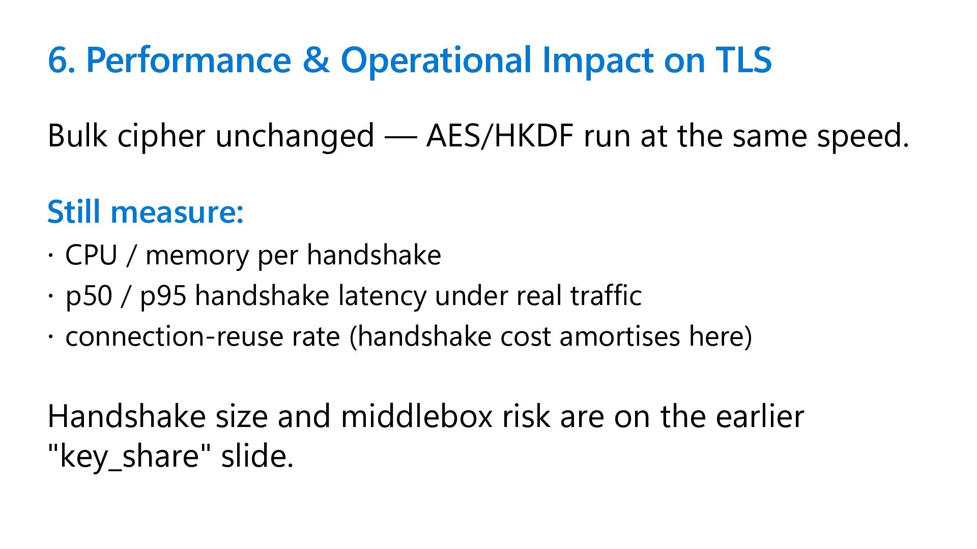 — AES/HKDF run at the same speed. Still measure: ž CPU / memory per handshake ž p50 / p95 handshake latency under real traffic ž connection-reuse rate (handshake cost amortises here) Handshake size and middlebox risk are on the earlier "key_share" slide.