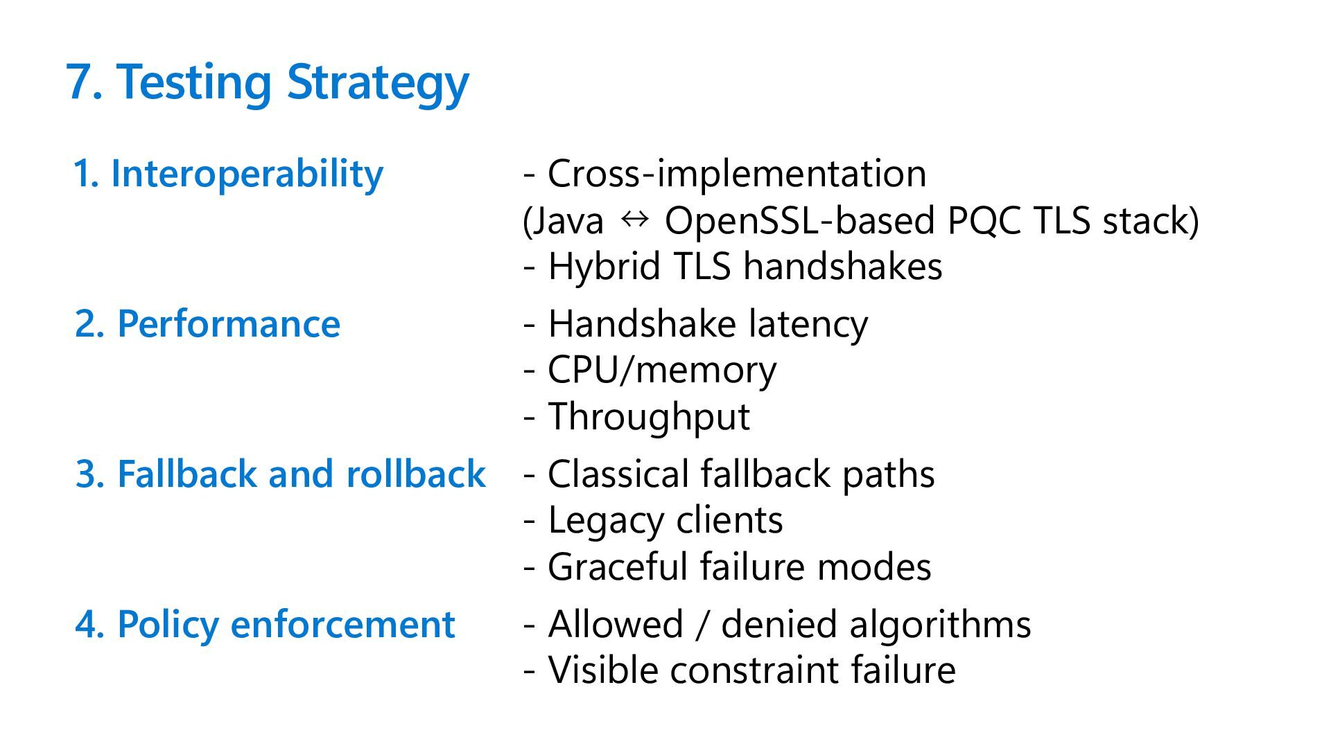 PQC TLS stack) - Hybrid TLS handshakes 2. Performance - Handshake latency - CPU/memory - Throughput 3. Fallback and rollback - Classical fallback paths - Legacy clients - Graceful failure modes 4. Policy enforcement - Allowed / denied algorithms - Visible constraint failure