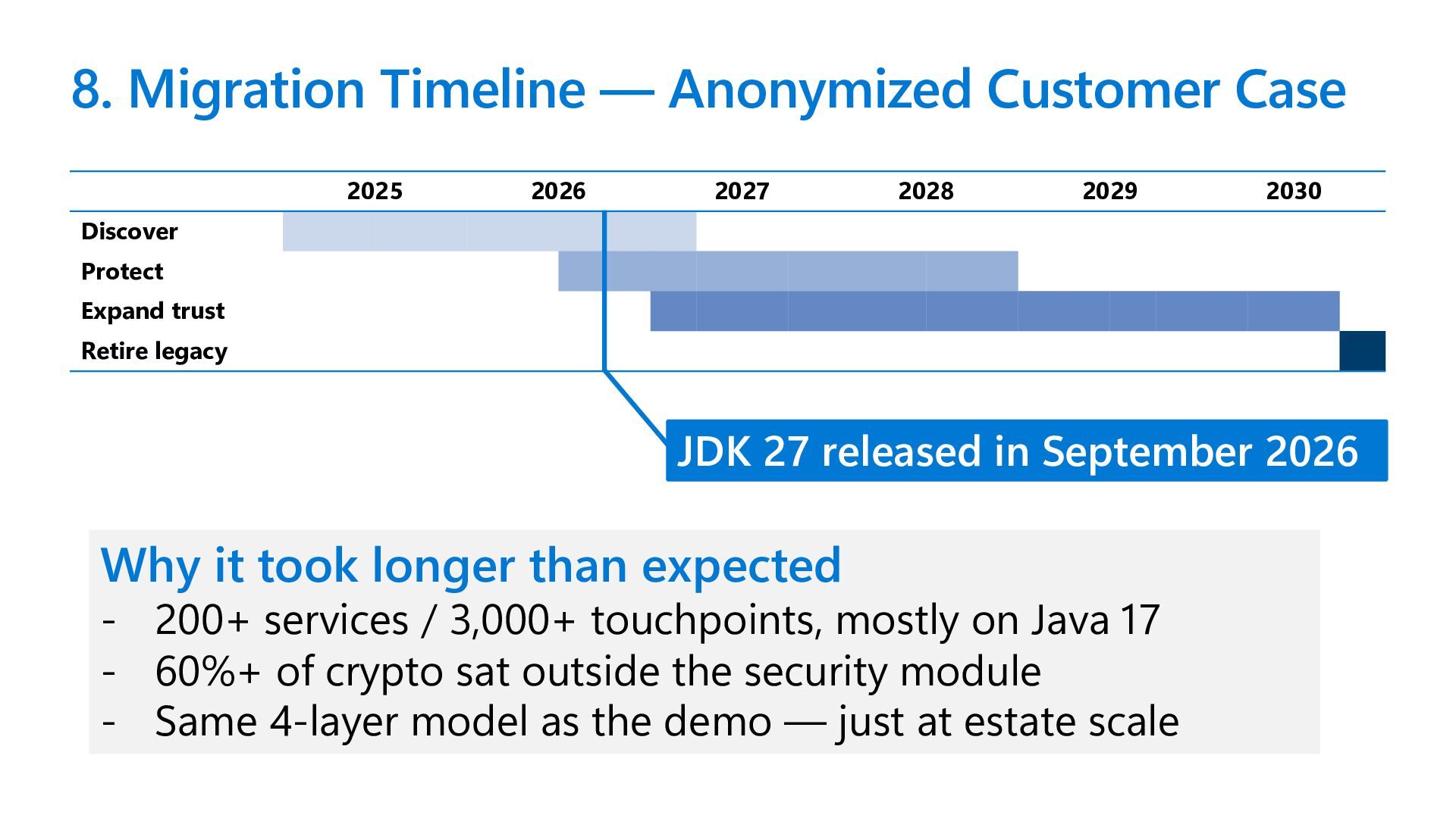 Retire legacy 8. Migration Timeline — Anonymized Customer Case JDK 27 released in September 2026 Why it took longer than expected - 200+ services / 3,000+ touchpoints, mostly on Java 17 - 60%+ of crypto sat outside the security module - Same 4-layer model as the demo — just at estate scale