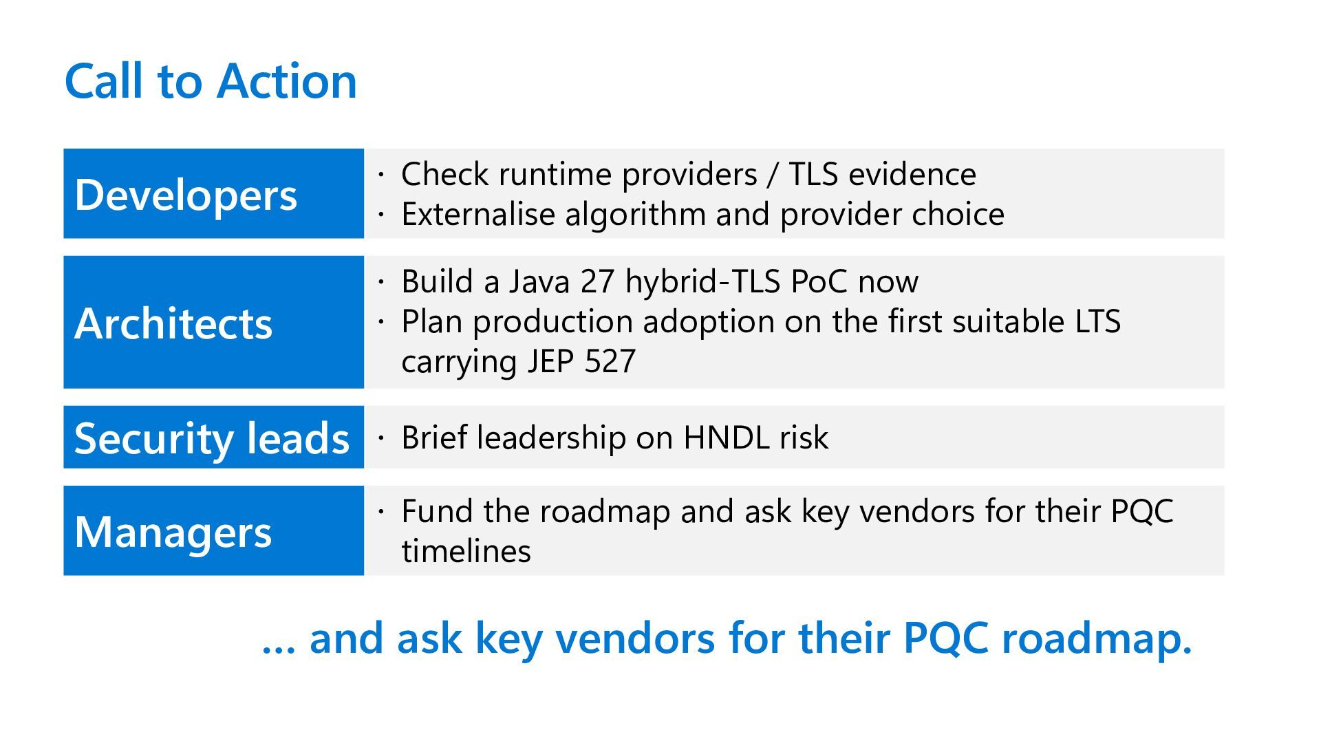 PQC roadmap. Developers Architects Security leads Managers ž Check runtime providers / TLS evidence ž Externalise algorithm and provider choice ž Build a Java 27 hybrid-TLS PoC now ž Plan production adoption on the first suitable LTS carrying JEP 527 ž Brief leadership on HNDL risk ž Fund the roadmap and ask key vendors for their PQC timelines