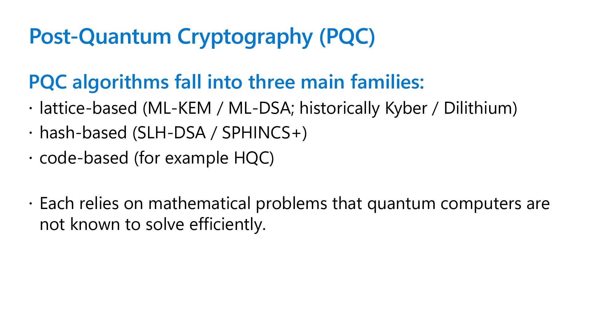 ž lattice-based (ML-KEM / ML-DSA; historically Kyber / Dilithium) ž hash-based (SLH-DSA / SPHINCS+) ž code-based (for example HQC) ž Each relies on mathematical problems that quantum computers are not known to solve efficiently.