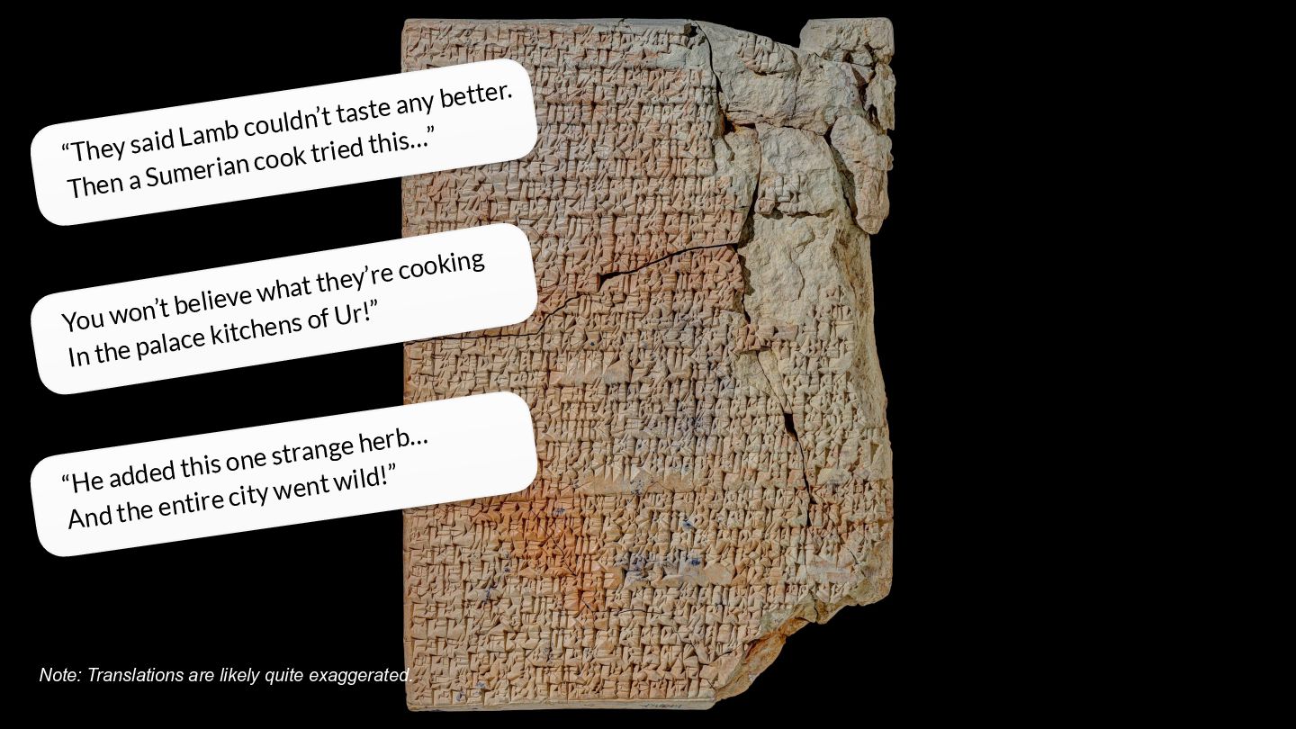 cook tried this…” You won’t believe what they’re cooking In the palace kitchens of Ur!” “He added this one strange herb… And the entire city went wild!” Note: Translations are likely quite exaggerated.