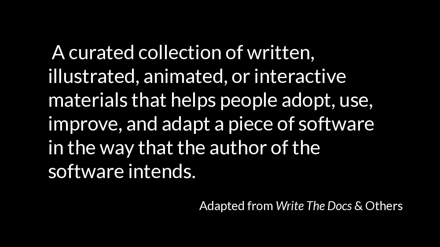 that helps people adopt, use, improve, and adapt a piece of software in the way that the author of the software intends. Adapted from Write The Docs & Others