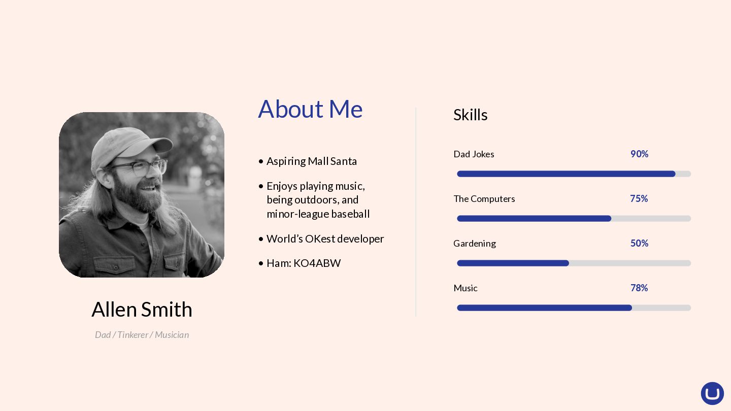 90% Dad / Tinkerer / Musician Allen Smith About Me • Aspiring Mall Santa • Enjoys playing music, being outdoors, and minor-league baseball • World’s OKest developer • Ham: KO4ABW
