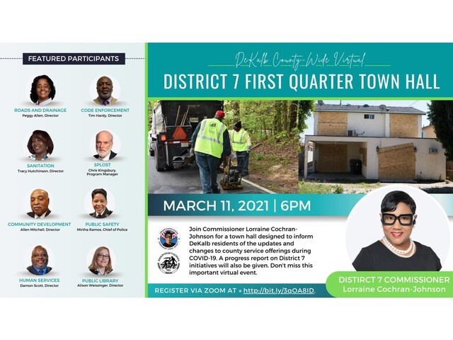 Commissioner Lorraine Cochran-Johnson hosted a town hall on March 11, 2021, to inform DeKalb residents of the updates and changes to county service offerings during COVID-19. Presentations were made and questions were answered by the following: Peggy Allen (Director, Roads and Drainage), Tim Hardy (Director, Code Enforcement), Tracy Hutchinson (Director, Sanitation), Chris Kingsbury (Program Manager, SPLOST), Allen Mitchell (Director, Community Development), Mirtha Ramos (Chief, Police Department), Damon Scott (Director, Human Services) and Alison Weissinger (Director, Public Library)