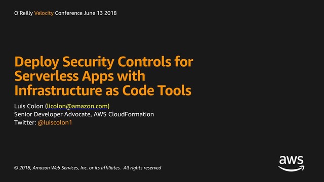 to worry about, but still plenty of things… • Many standard best practices apply • Improve controls, logging, monitoring, etc. incrementally and on an ongoing basis • Automate your controls • Leverage the many tools available #VelocityConf @luiscolon1