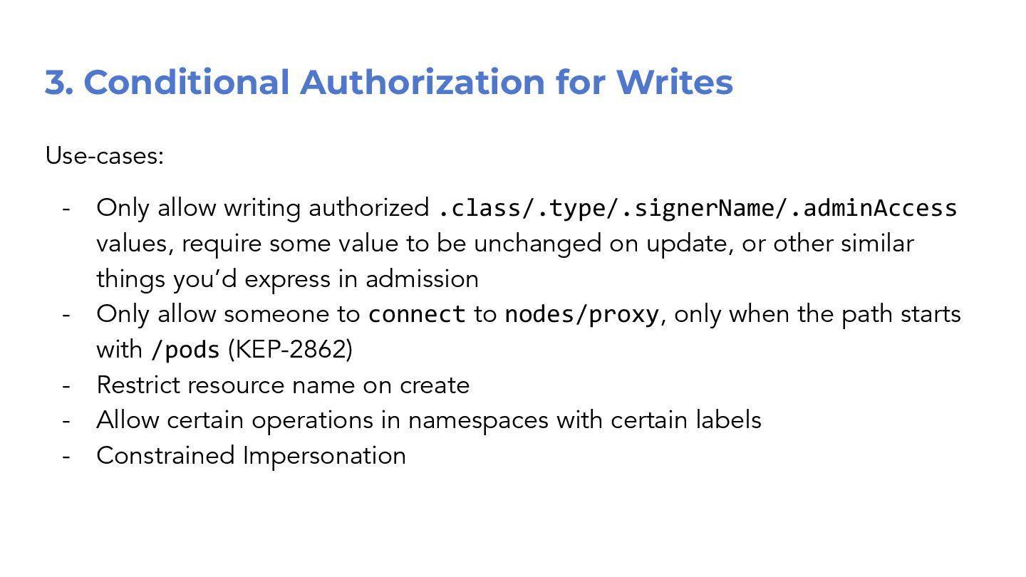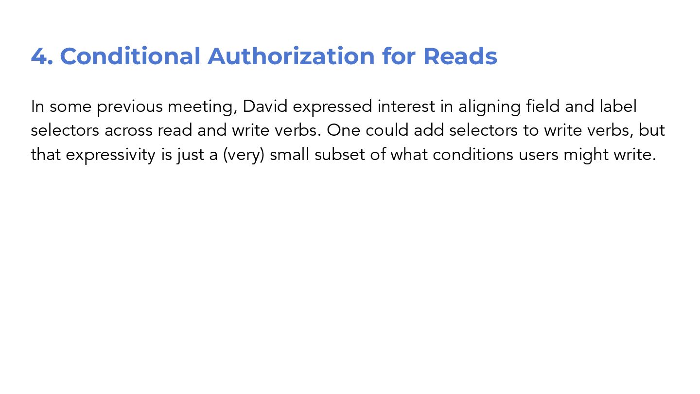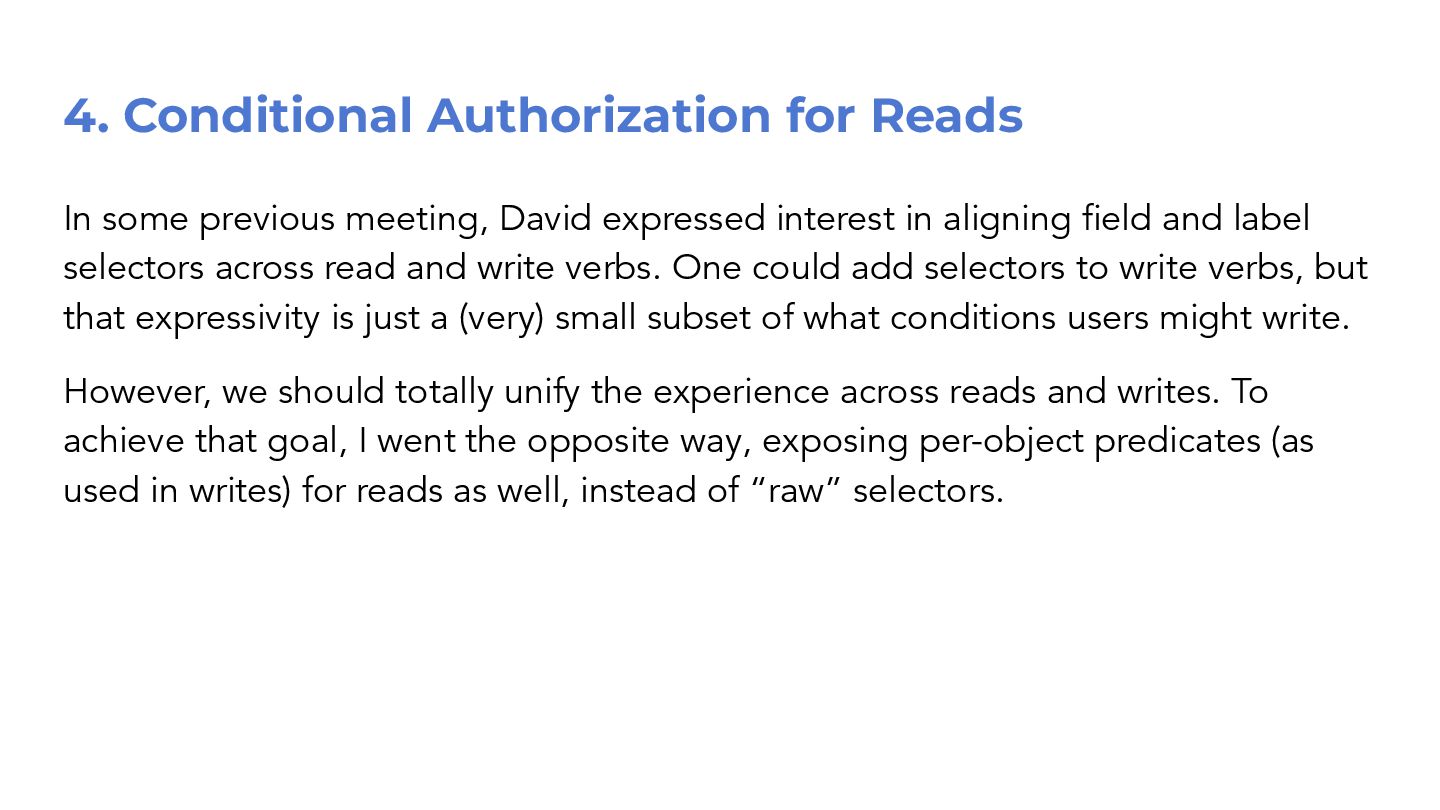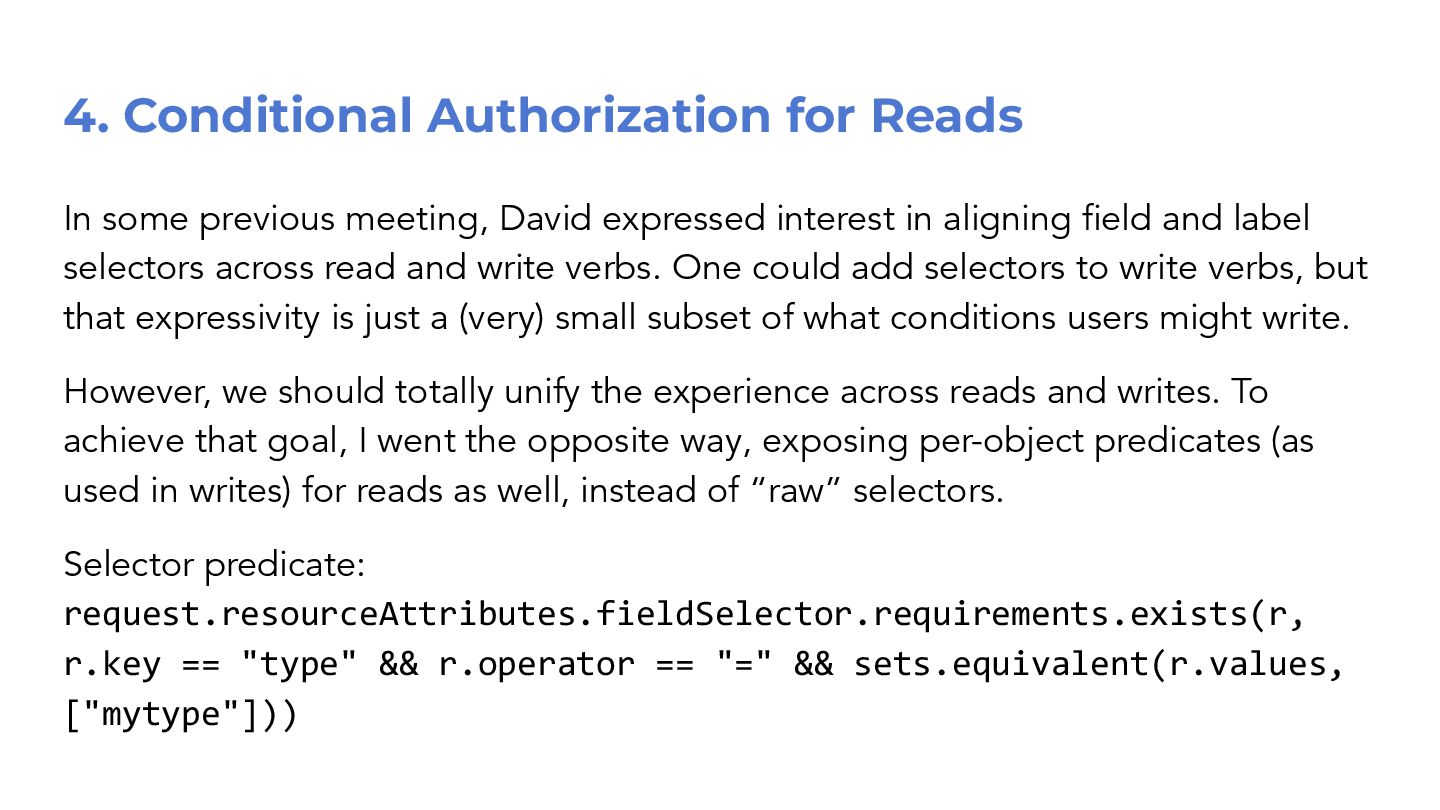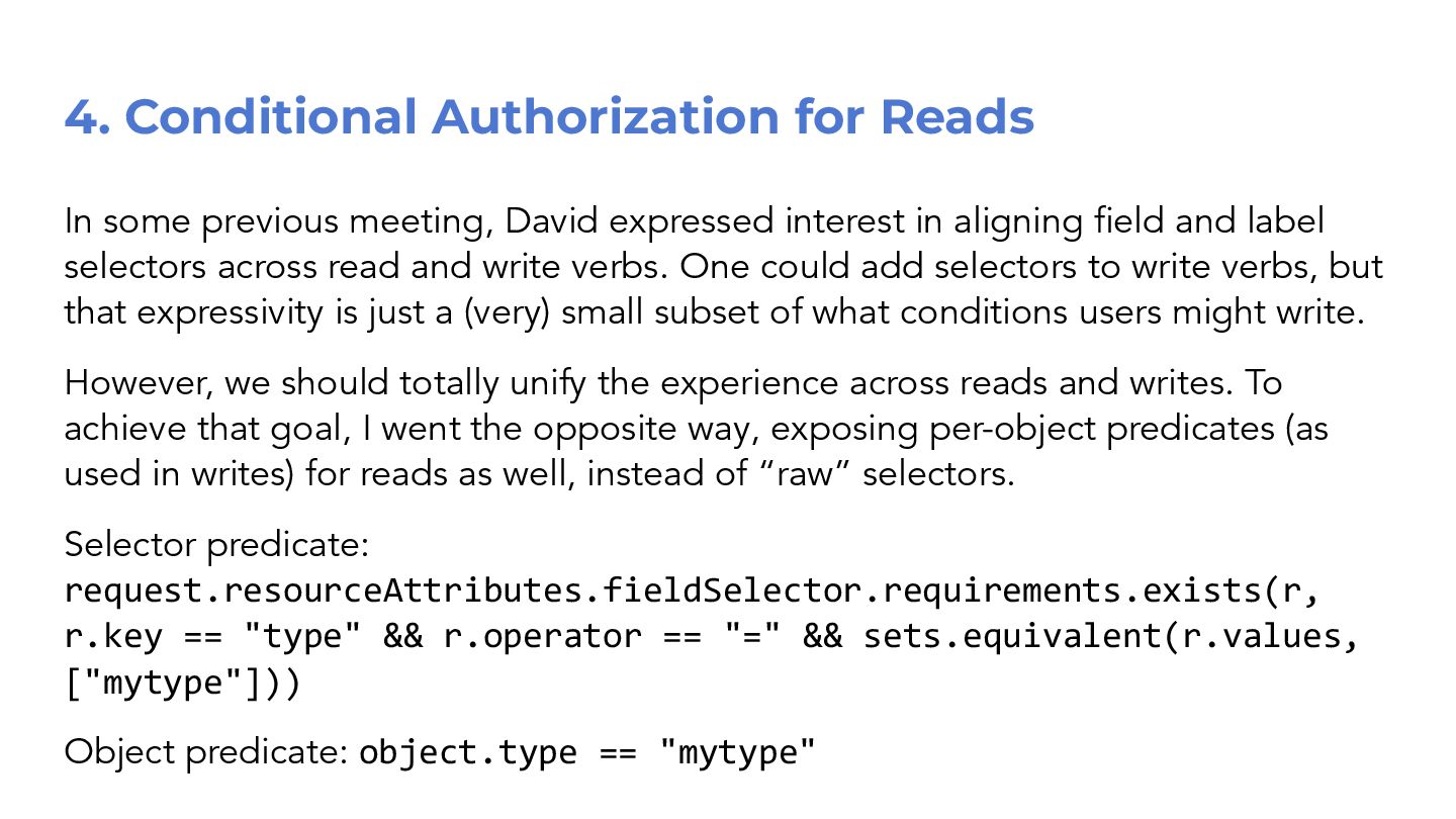 expressed interest in aligning field and label selectors across read and write verbs. One could add selectors to write verbs, but that expressivity is just a (very) small subset of what conditions users might write. However, we should totally unify the experience across reads and writes. To achieve that goal, I went the opposite way, exposing per-object predicates (as used in writes) for reads as well, instead of “raw” selectors. Selector predicate: request.resourceAttributes.fieldSelector.requirements.exists(r, r.key == "type" && r.operator == "=" && sets.equivalent(r.values, ["mytype"])) Object predicate: object.type == "mytype"