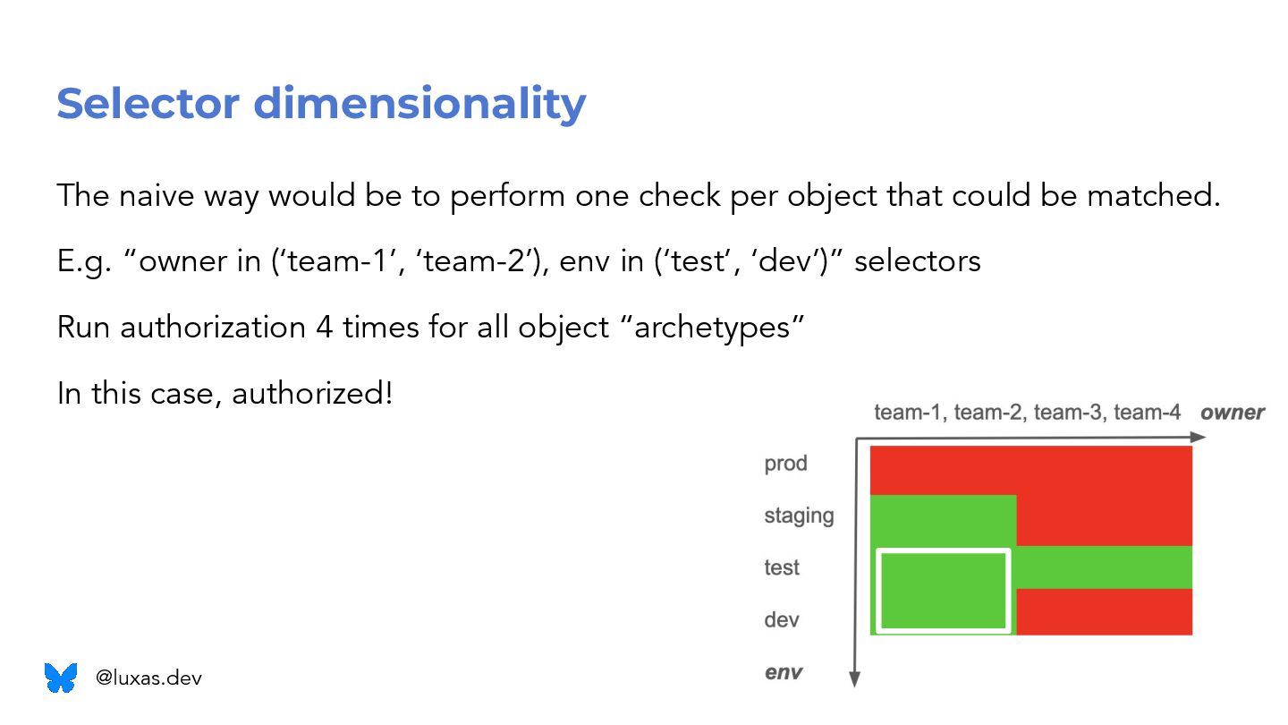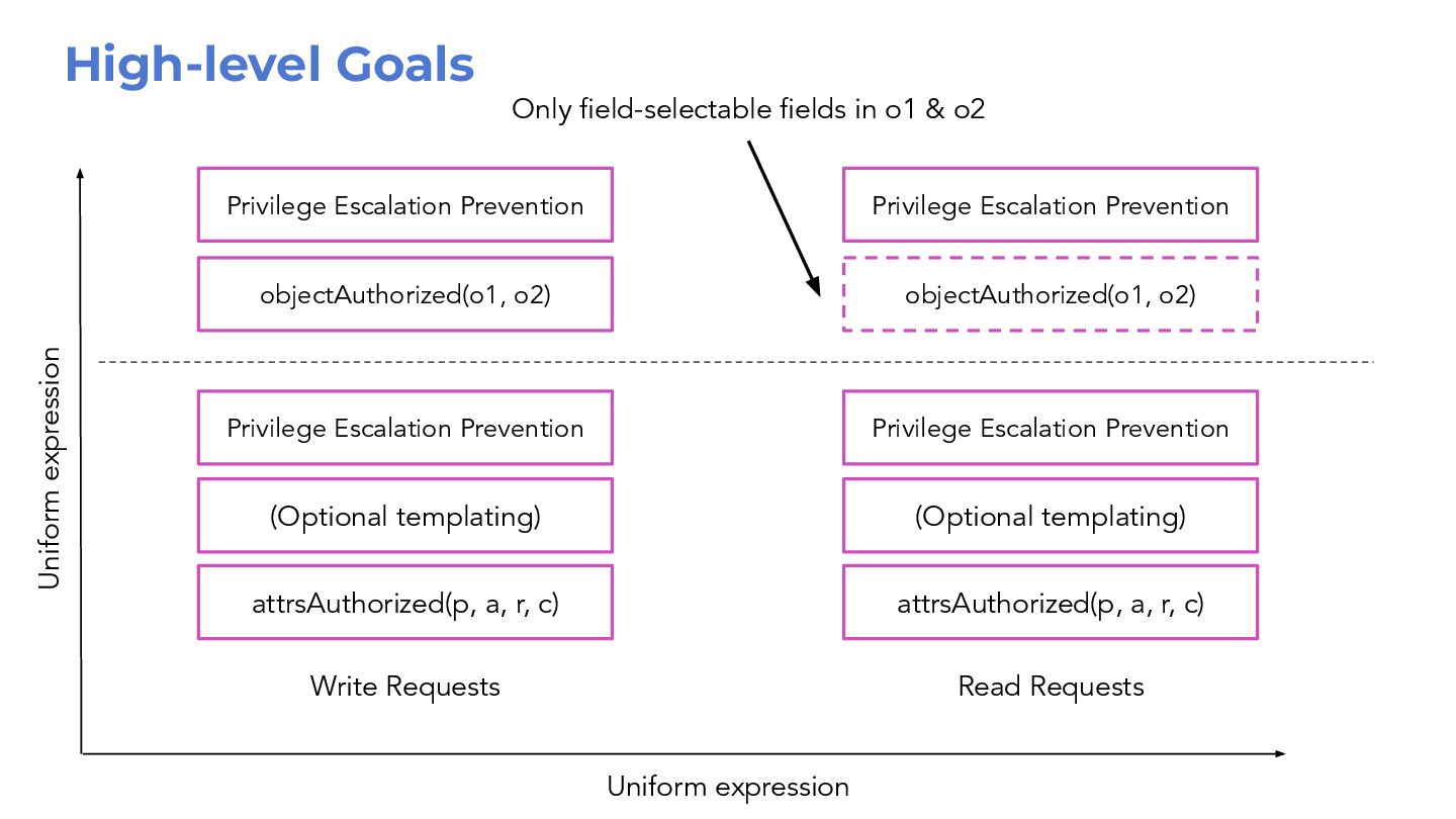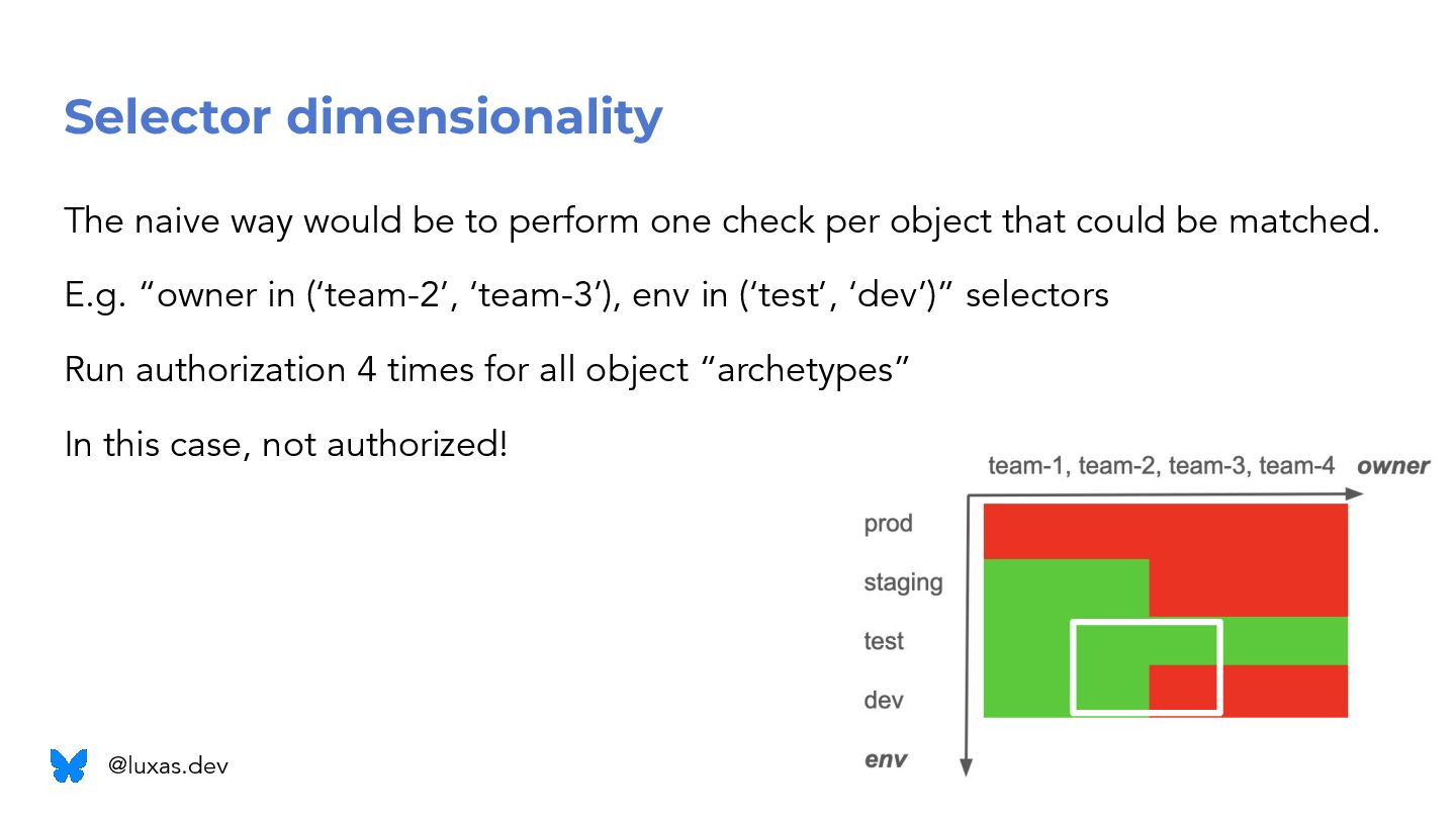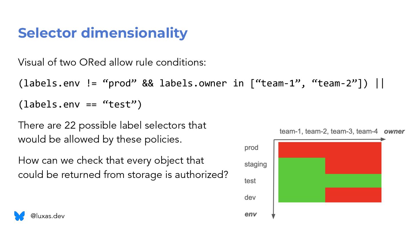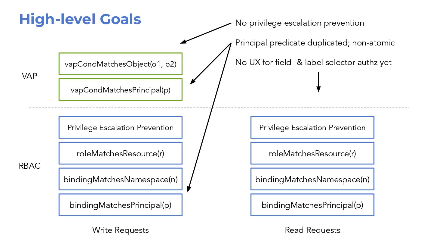 expressed interest in aligning field and label selectors across read and write verbs. One could add selectors to write verbs, but that expressivity is just a (very) small subset of what conditions users might write. However, we should totally unify the experience across reads and writes. To achieve that goal, I went the opposite way, exposing per-object predicates (as used in writes) for reads as well, instead of “raw” selectors. Selector predicate: request.resourceAttributes.fieldSelector.requirements.exists(r, r.key == "type" && r.operator == "=" && sets.equivalent(r.values, ["mytype"])) Object predicate: object.type == "mytype"