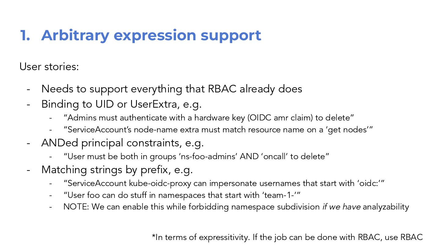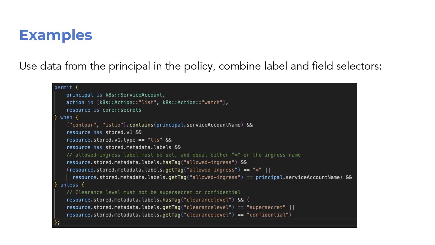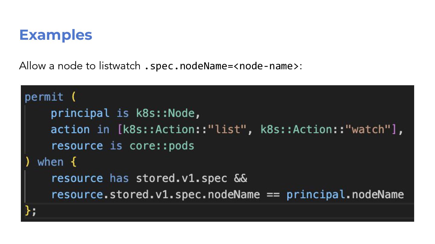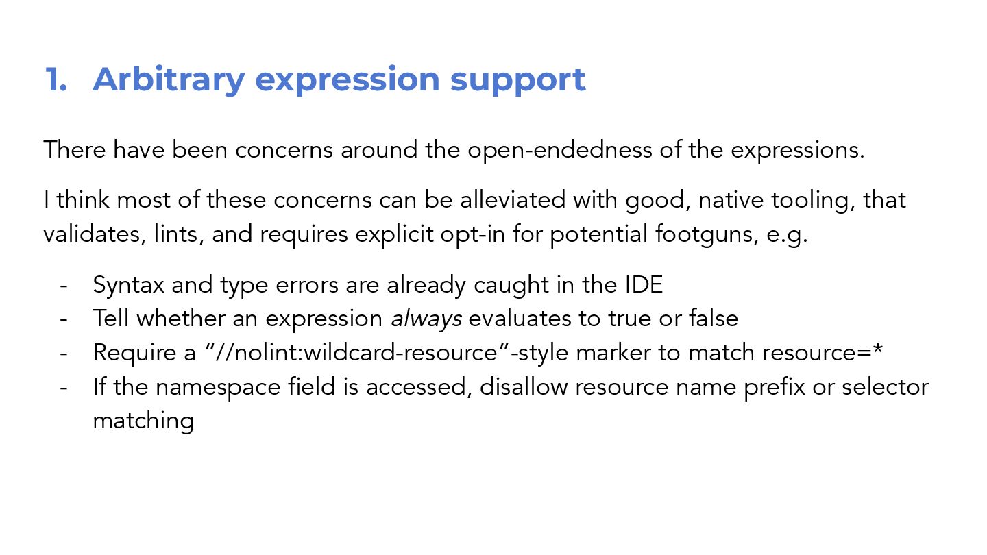 expressed interest in aligning field and label selectors across read and write verbs. One could add selectors to write verbs, but that expressivity is just a (very) small subset of what conditions users might write. However, we should totally unify the experience across reads and writes. To achieve that goal, I went the opposite way, exposing per-object predicates (as used in writes) for reads as well, instead of “raw” selectors. Selector predicate: request.resourceAttributes.fieldSelector.requirements.exists(r, r.key == "type" && r.operator == "=" && sets.equivalent(r.values, ["mytype"])) Object predicate: object.type == "mytype"