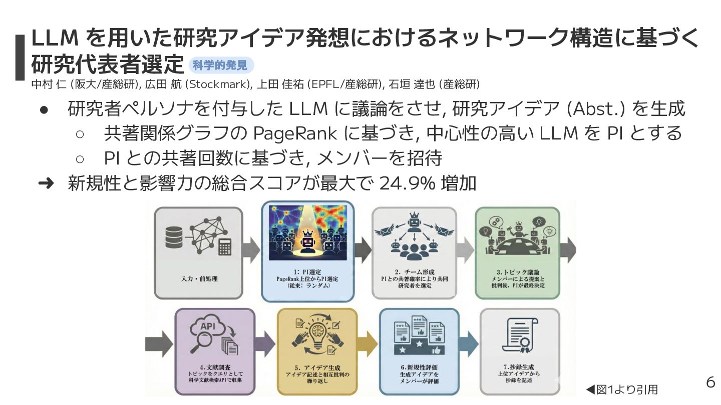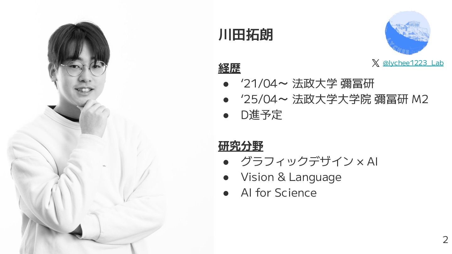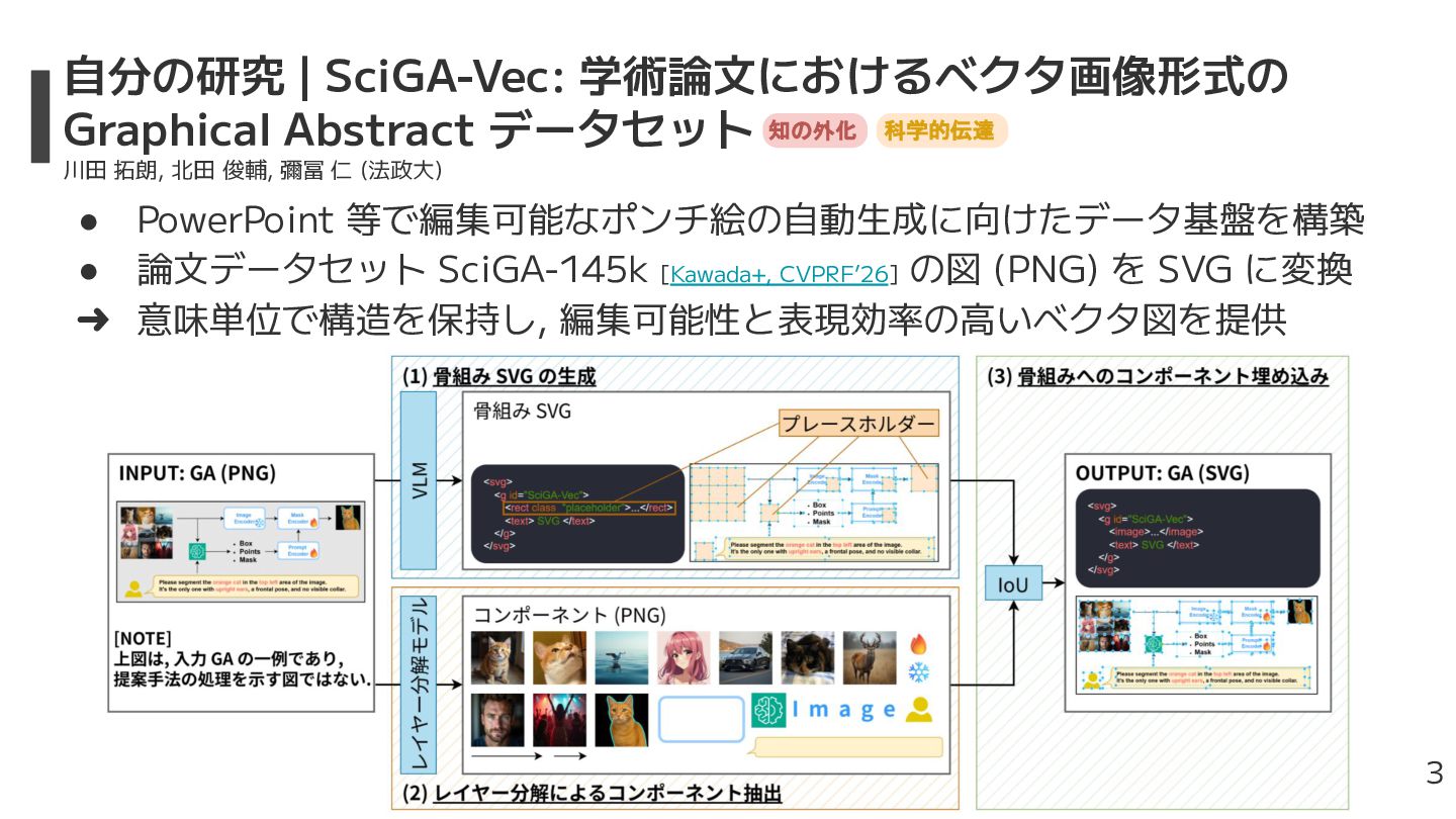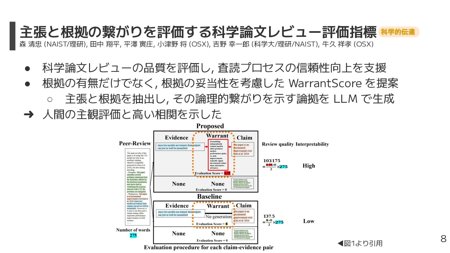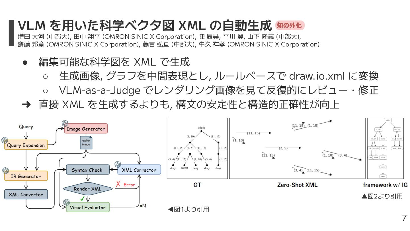 ◦ VLM-as-a-Judge でレンダリング画像を見て反復的にレビュー・修正 ➜ 直接 XML を生成するよりも, 構文の安定性と構造的正確性が向上 VLM を用いた科学ベクタ図 XML の自動生成 増田 大河 (中部大), 田中 翔平 (OMRON SINIC X Corporation), 陳 辰昊, 平川 翼, 山下 隆義 (中部大), 齋藤 邦章 (OMRON SINIC X Corporation), 藤吉 弘亘 (中部大), 牛久 祥孝 (OMRON SINIC X Corporation) 7 知の外化 ◀図1より引用 ▲図2より引用
