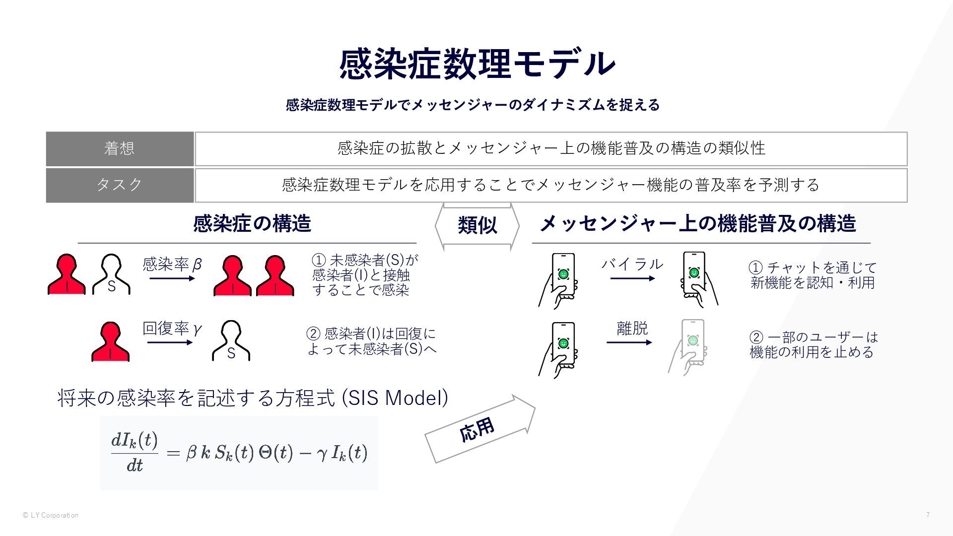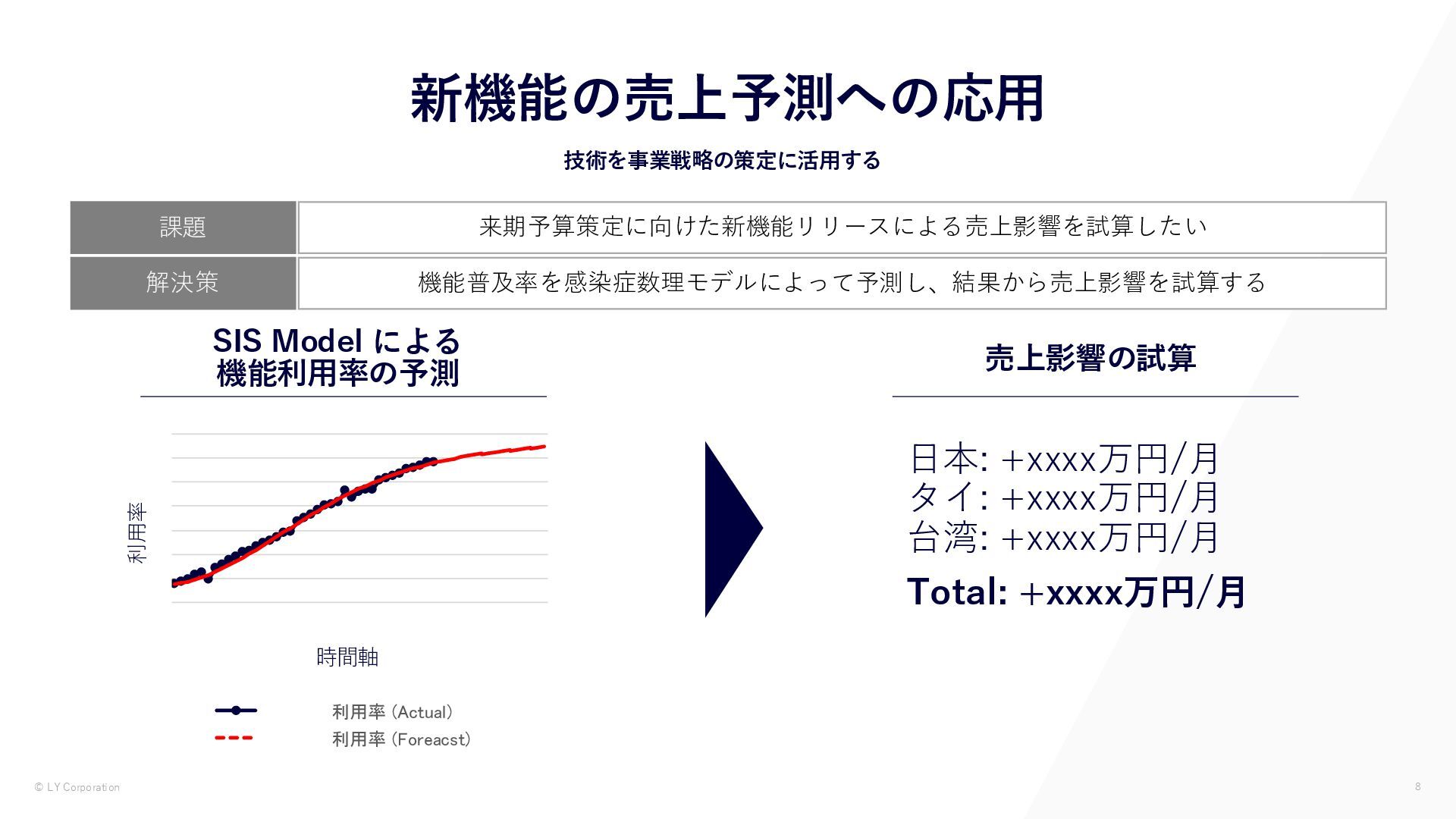 25% 30% 35% 40% 2021/9 2021/12 2022/3 2022/6 2022/9 2022/12 2023/3 2023/6 2023/9 2023/12 2024/3 2024/6 2024/9 2024/12 2025/3 2025/6 2025/9 2025/12 2026/3 Reaction 利用率 (Actual) Reaction 利用率 (Foreacst) SIS Model による 機能利用率の予測 売上影響の試算 日本: +xxxx万円/月 タイ: +xxxx万円/月 台湾: +xxxx万円/月 Total: +xxxx万円/月 課題 来期予算策定に向けた新機能リリースによる売上影響を試算したい 解決策 機能普及率を感染症数理モデルによって予測し、結果から売上影響を試算する 技術を事業戦略の策定に活用する 時間軸 利用率