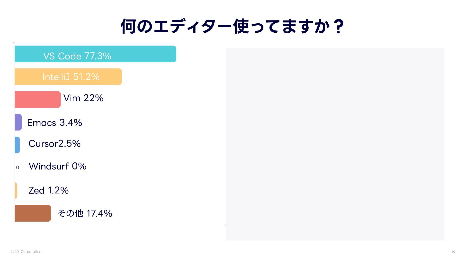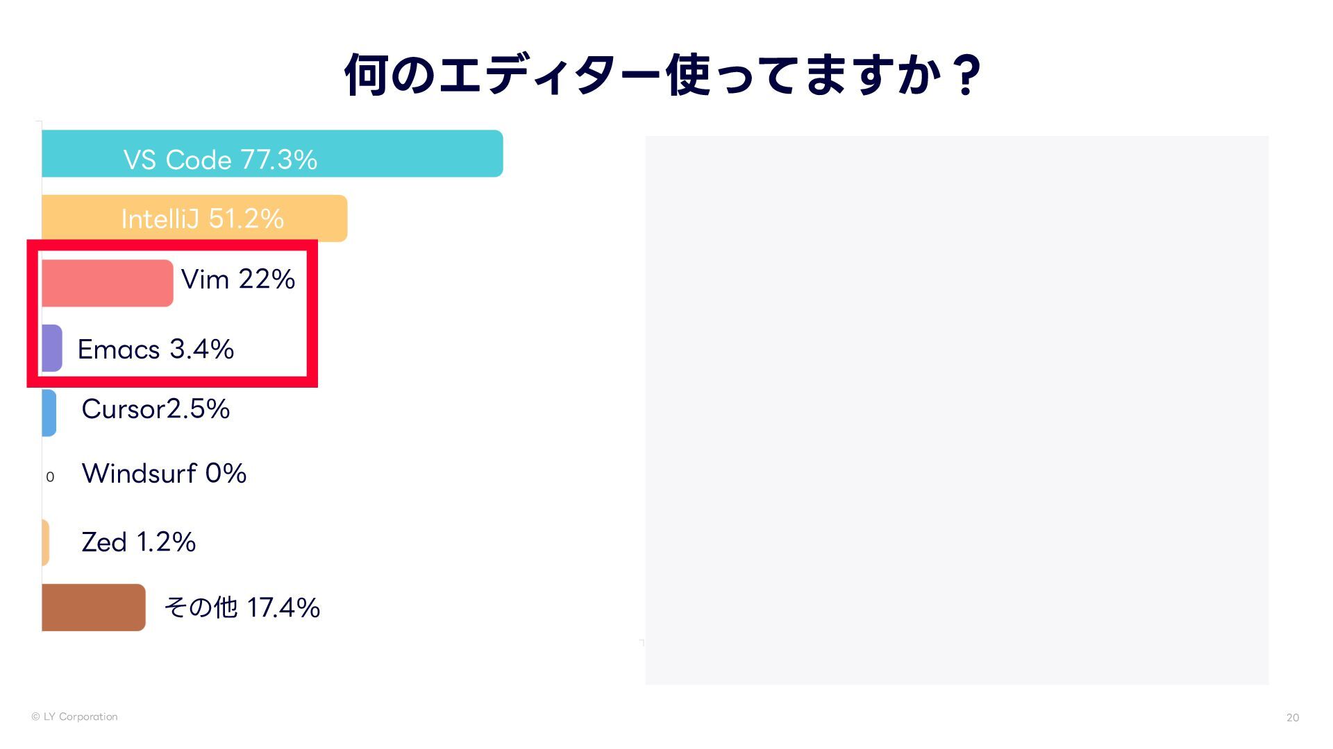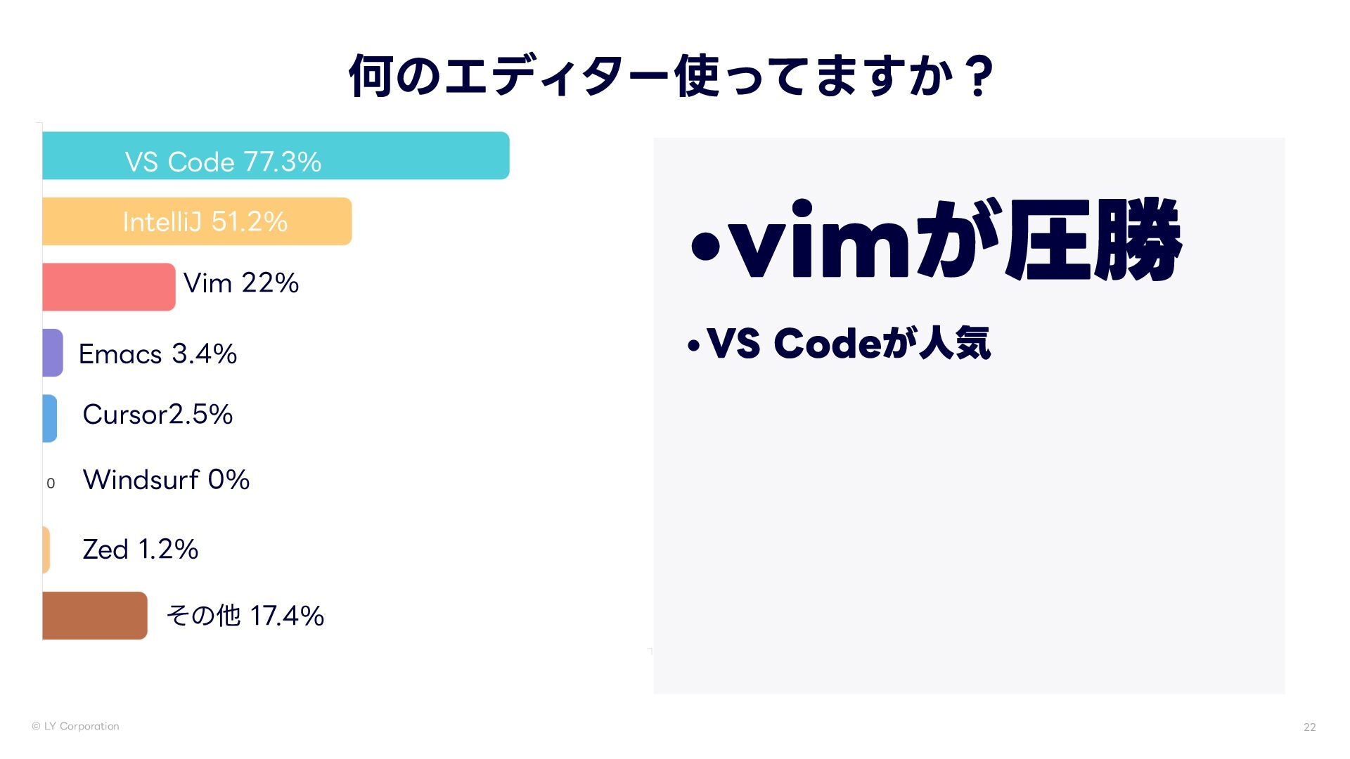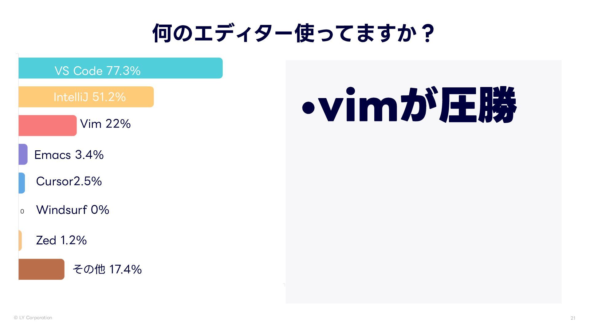 -:$PSQPSBUJPO 何のエディター使ってますか? •vimが圧勝 74$PEF *OUFMMJ+ 7JN &NBDT $VSTPS 8JOETVSG