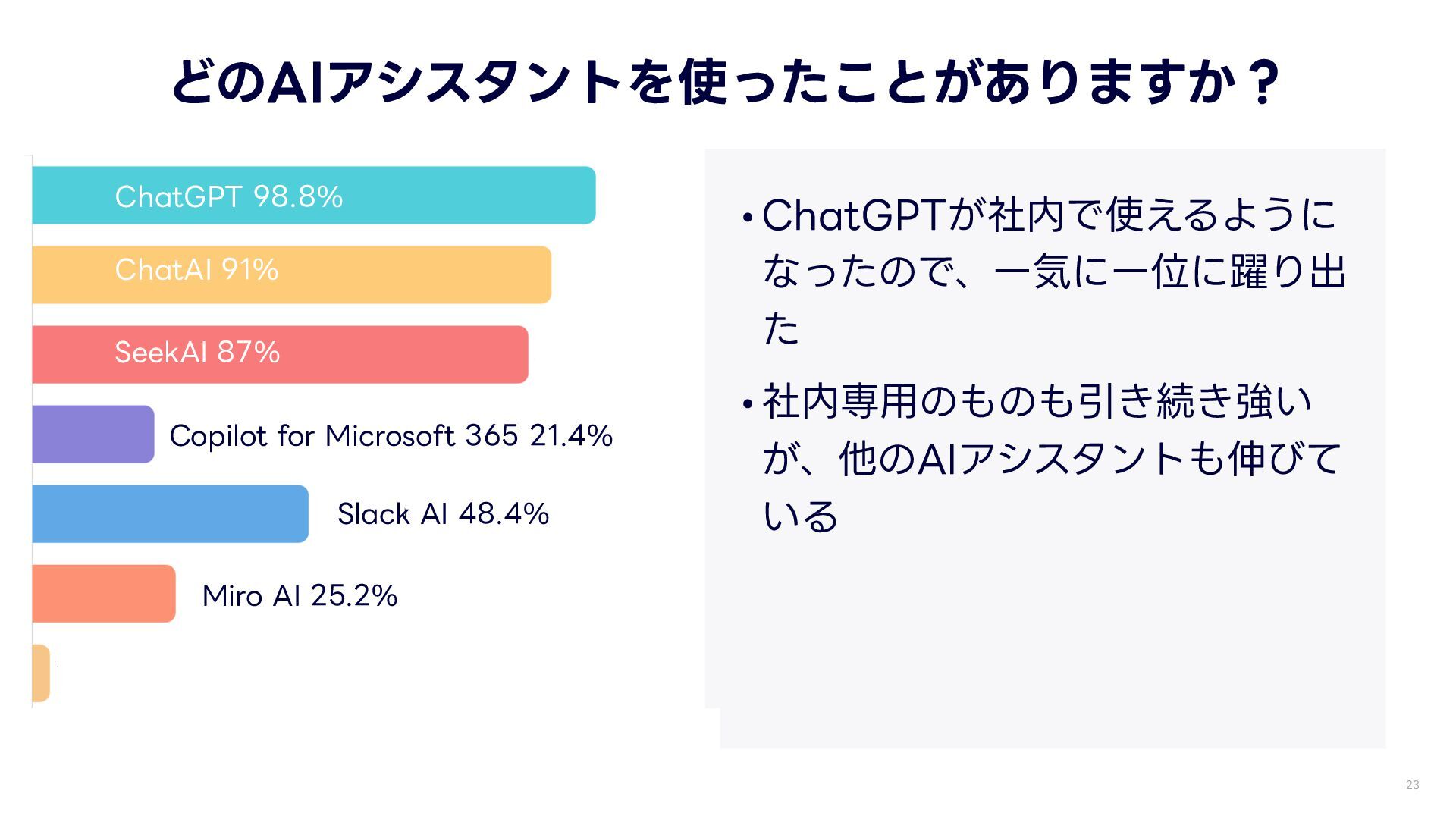 -:$PSQPSBUJPO どのAIアシスタントを使ったことがありますか? 74$PEF •ChatGPTが社内で使えるように なったので、 一 気に 一 位に躍り出