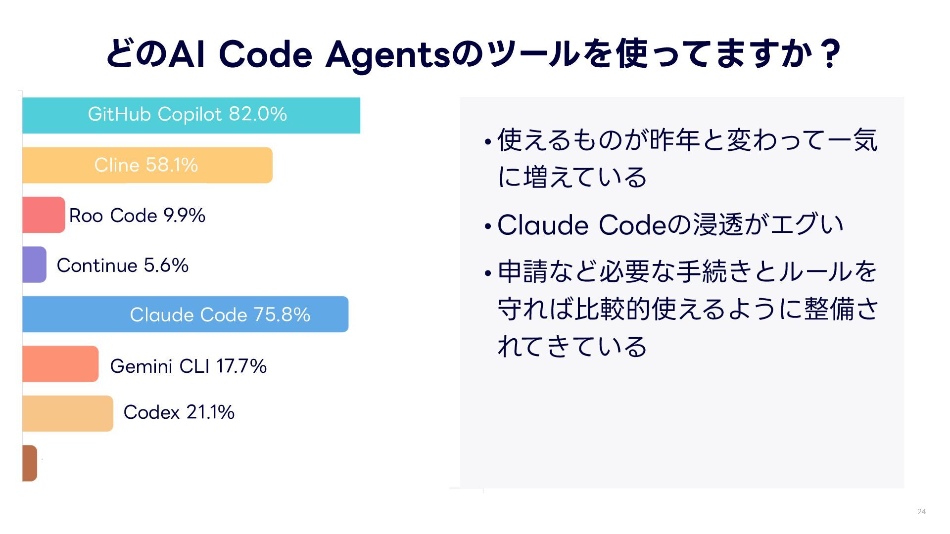 •Claude Codeの浸透がエグい •申請など必要な 手 続きとルールを 守れば 比 較的使えるように整備さ れてきている $MJOF 4FFL"* $POUJOVF $PEFY (FNJOJ$-* $MBVEF$PEF 3PP$PEF