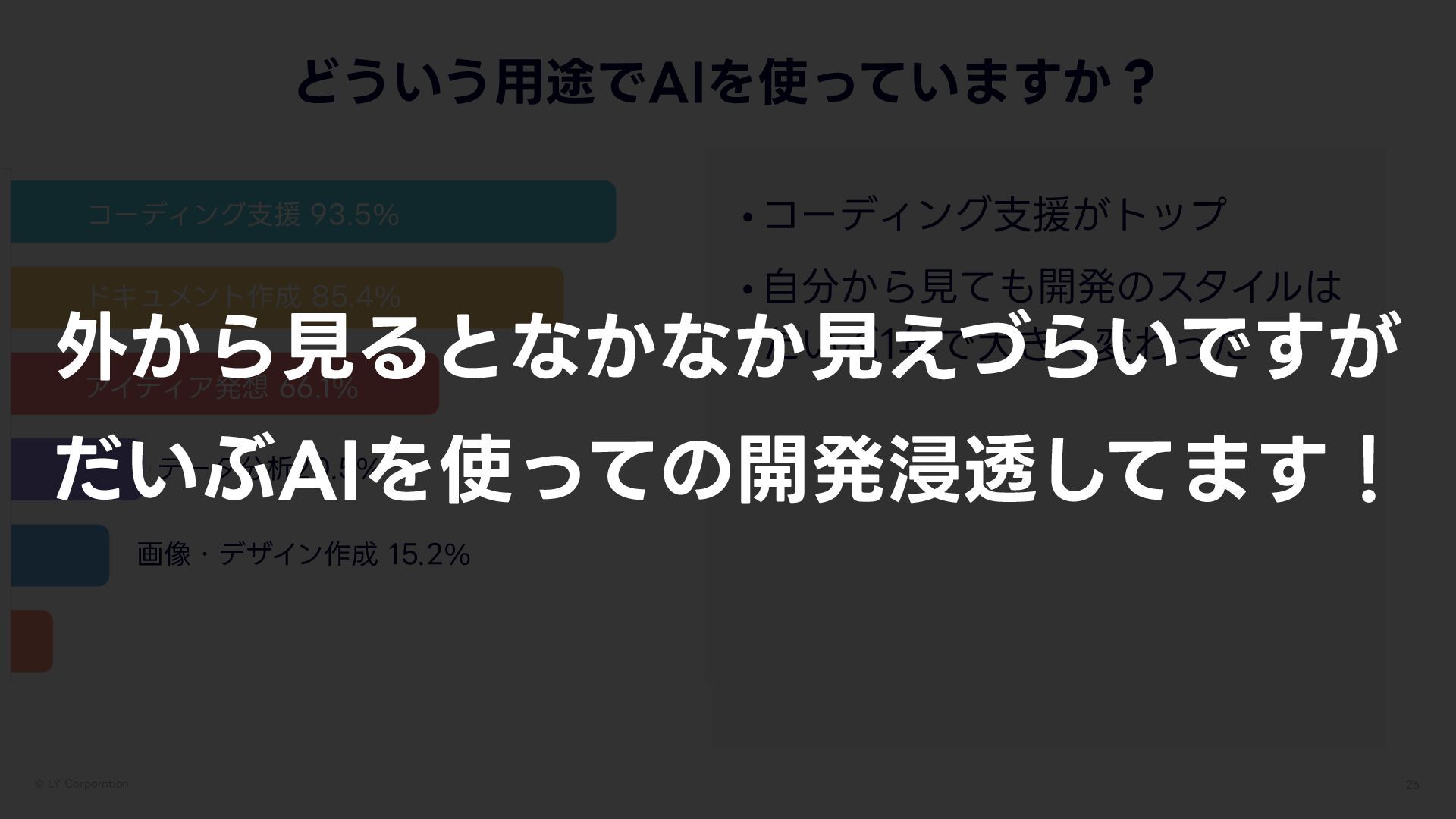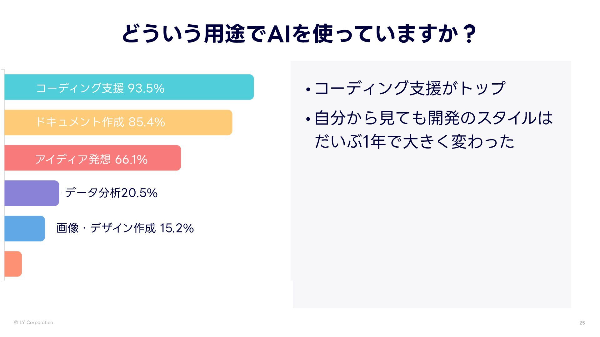 -:$PSQPSBUJPO どういう 用 途でAIを使っていますか? •コーディング 支 援がトップ • 自