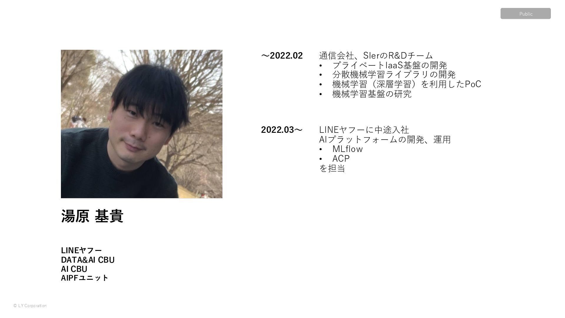 CBU AIPFユニット 〜2022.02 通信会社、SIerのR&Dチーム • プライベートIaaS基盤の開発 • 分散機械学習ライブラリの開発 • 機械学習(深層学習)を利用したPoC • 機械学習基盤の研究 2022.03〜 LINEヤフーに中途入社 AIプラットフォームの開発、運用 • MLflow • ACP を担当