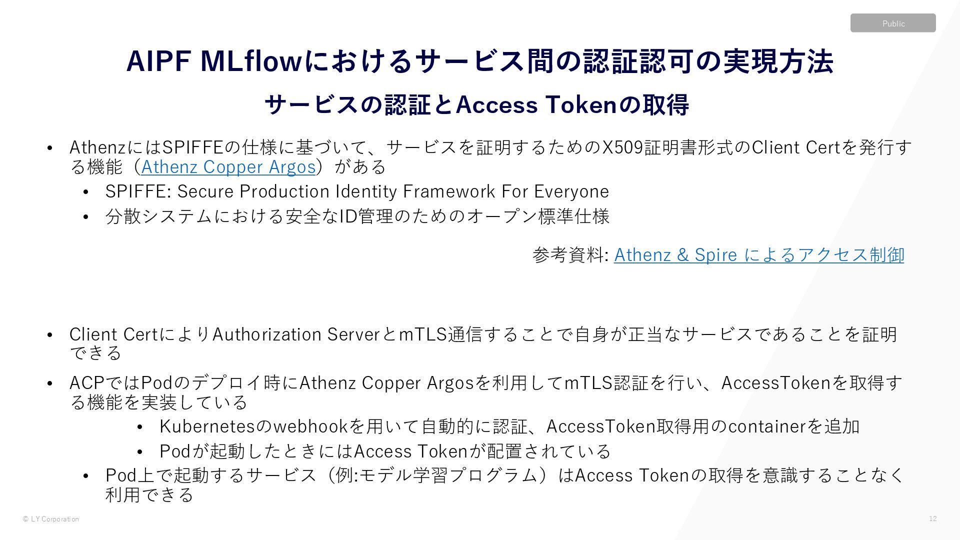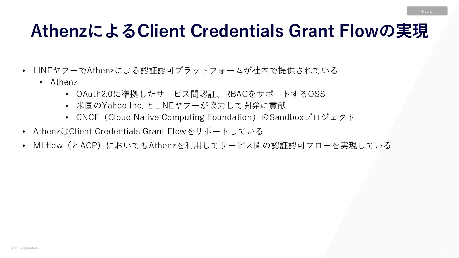 • 米国のYahoo Inc. とLINEヤフーが協力して開発に貢献 • CNCF(Cloud Native Computing Foundation)のSandboxプロジェクト • AthenzはClient Credentials Grant Flowをサポートしている • MLflow(とACP)においてもAthenzを利用してサービス間の認証認可フローを実現している 11 AthenzによるClient Credentials Grant Flowの実現