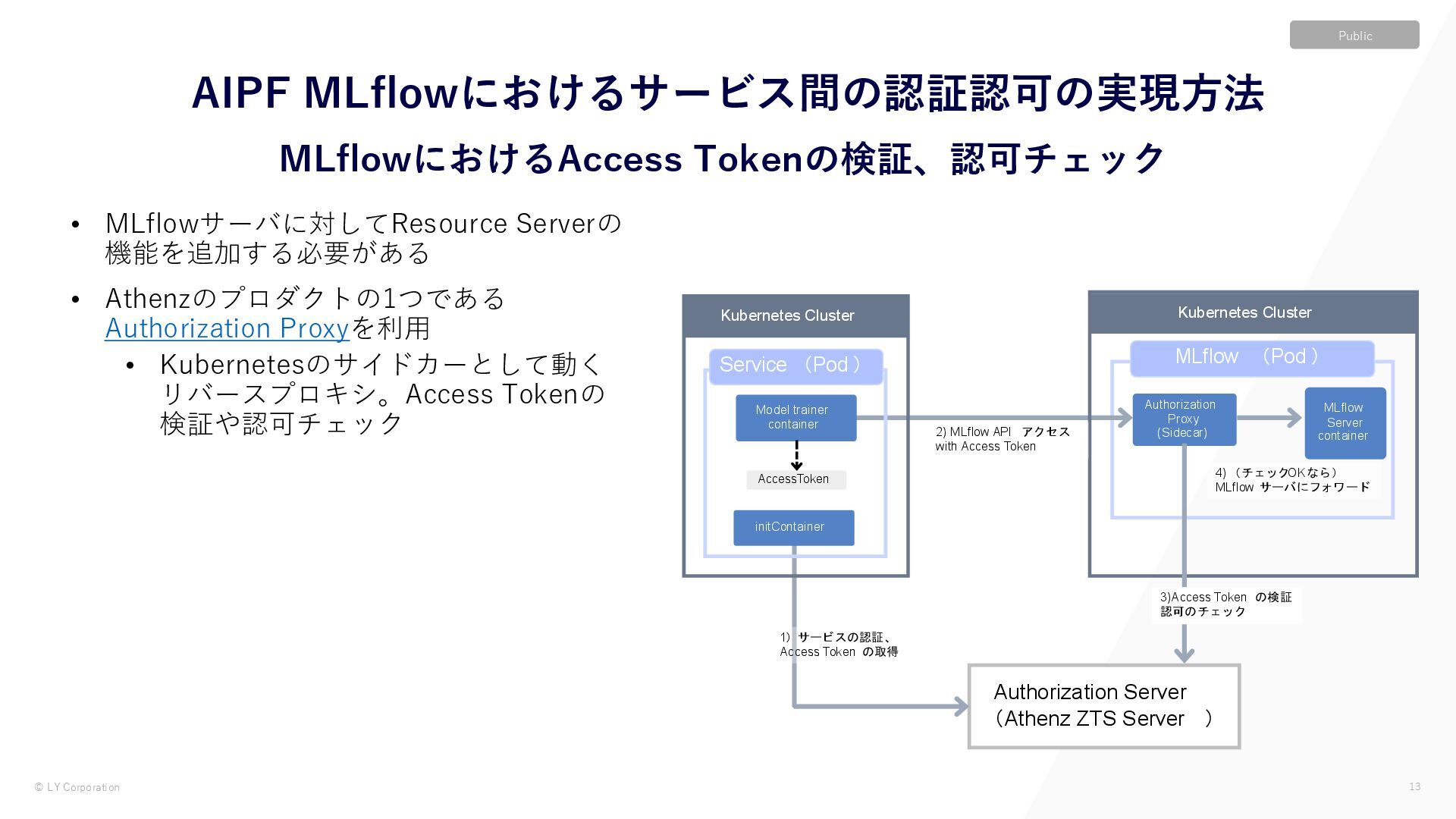 • SPIFFE: Secure Production Identity Framework For Everyone • 分散システムにおける安全なID管理のためのオープン標準仕様 • Client CertによりAuthorization ServerとmTLS通信することで自身が正当なサービスであることを証明 できる • ACPではPodのデプロイ時にAthenz Copper Argosを利用してmTLS認証を行い、AccessTokenを取得す る機能を実装している • Kubernetesのwebhookを用いて自動的に認証、AccessToken取得用のcontainerを追加 • Podが起動したときにはAccess Tokenが配置されている • Pod上で起動するサービス(例:モデル学習プログラム)はAccess Tokenの取得を意識することなく 利用できる 12 AIPF MLflowにおけるサービス間の認証認可の実現方法 サービスの認証とAccess Tokenの取得 参考資料: Athenz & Spire によるアクセス制御