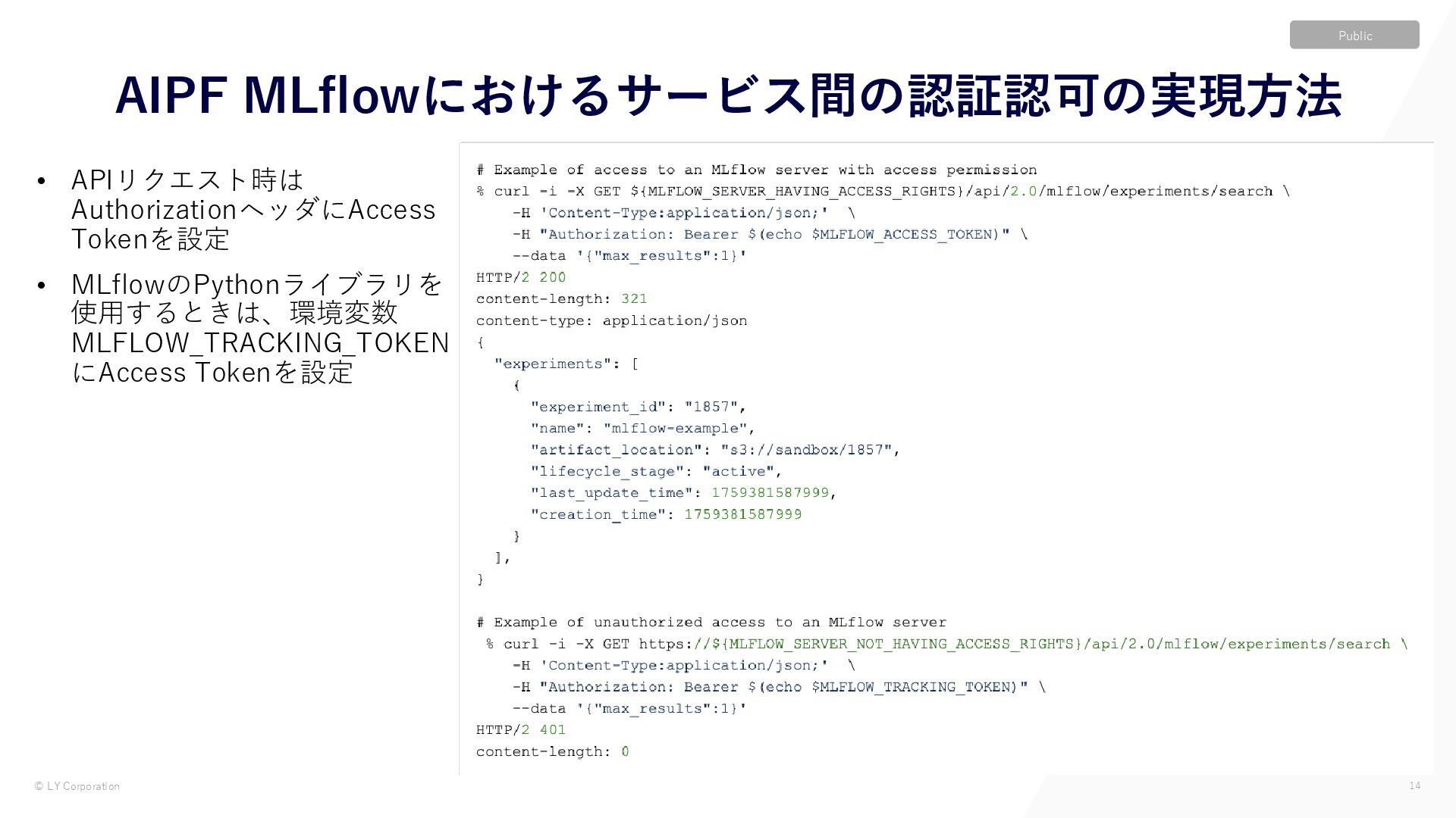 © LY Corporation Public 14 AIPF MLflowにおけるサービス間の認証認可の実現方法 • APIリクエスト時は AuthorizationヘッダにAccess