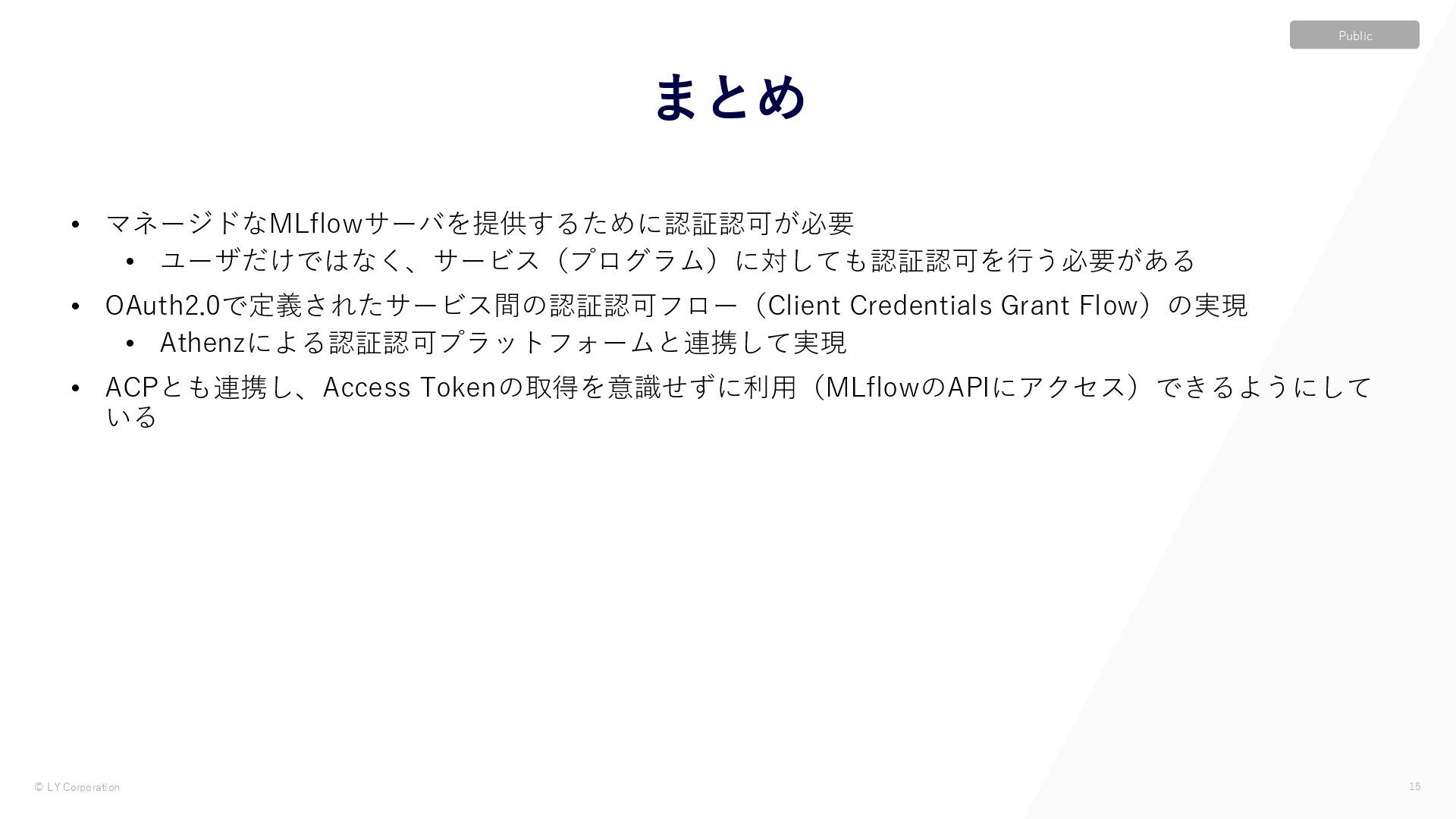 © LY Corporation Public • マネージドなMLflowサーバを提供するために認証認可が必要 • ユーザだけではなく、サービス(プログラム)に対しても認証認可を行う必要がある • OAuth2.0で定義されたサービス間の認証認可フロー(Client