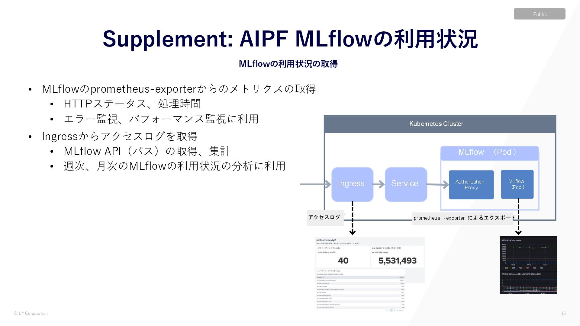 © LY Corporation Public • MLflowのprometheus-exporterからのメトリクスの取得 • HTTPステータス、処理時間 • エラー監視、パフォーマンス監視に利用