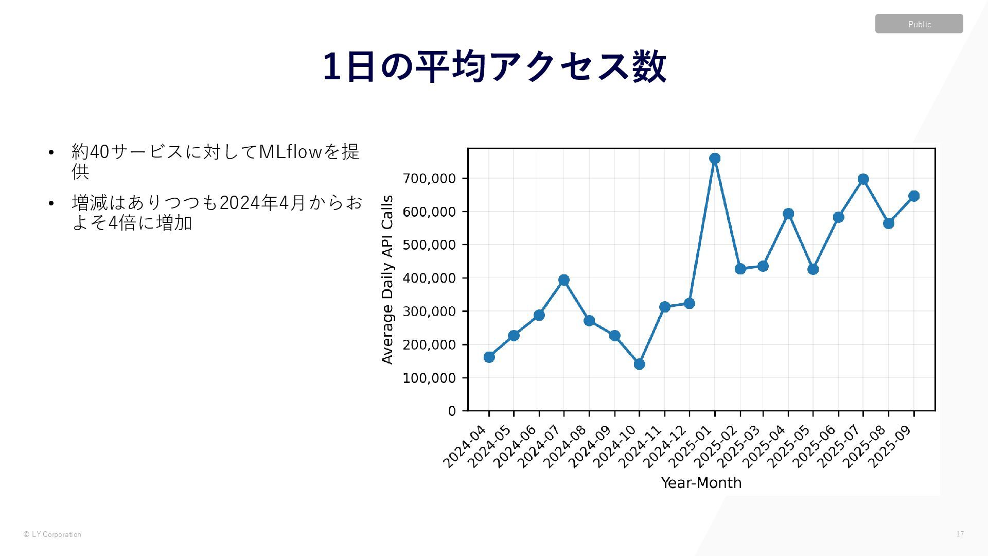 © LY Corporation Public • 約40サービスに対してMLflowを提 供 • 増減はありつつも2024年4月からお よそ4倍に増加