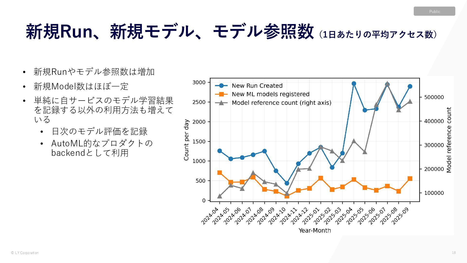 © LY Corporation Public • 新規Runやモデル参照数は増加 • 新規Model数はほぼ一定 • 単純に自サービスのモデル学習結果