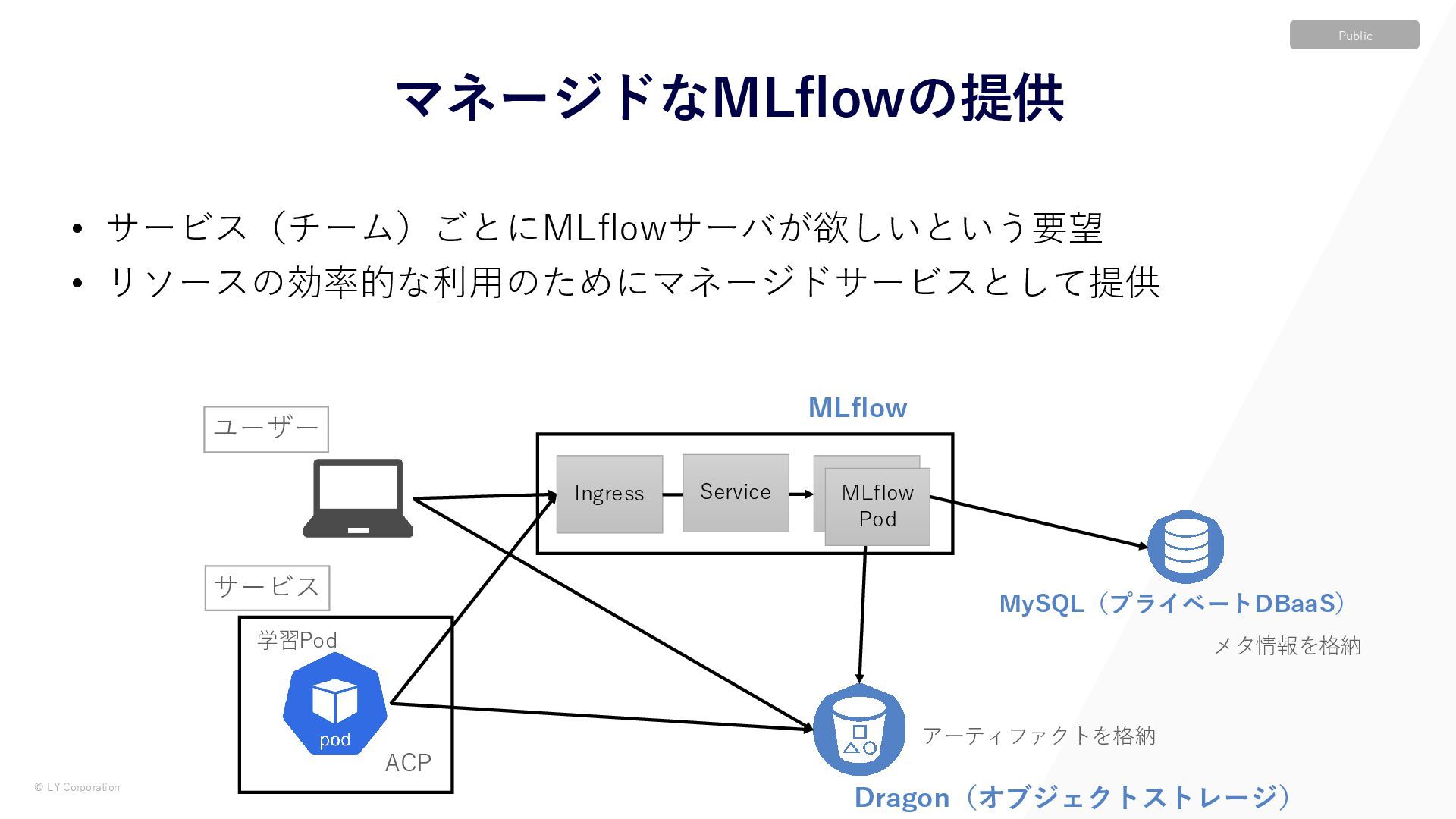 © LY Corporation Public • サービス(チーム)ごとにMLflowサーバが欲しいという要望 • リソースの効率的な利用のためにマネージドサービスとして提供 マネージドなMLflowの提供 ユーザー