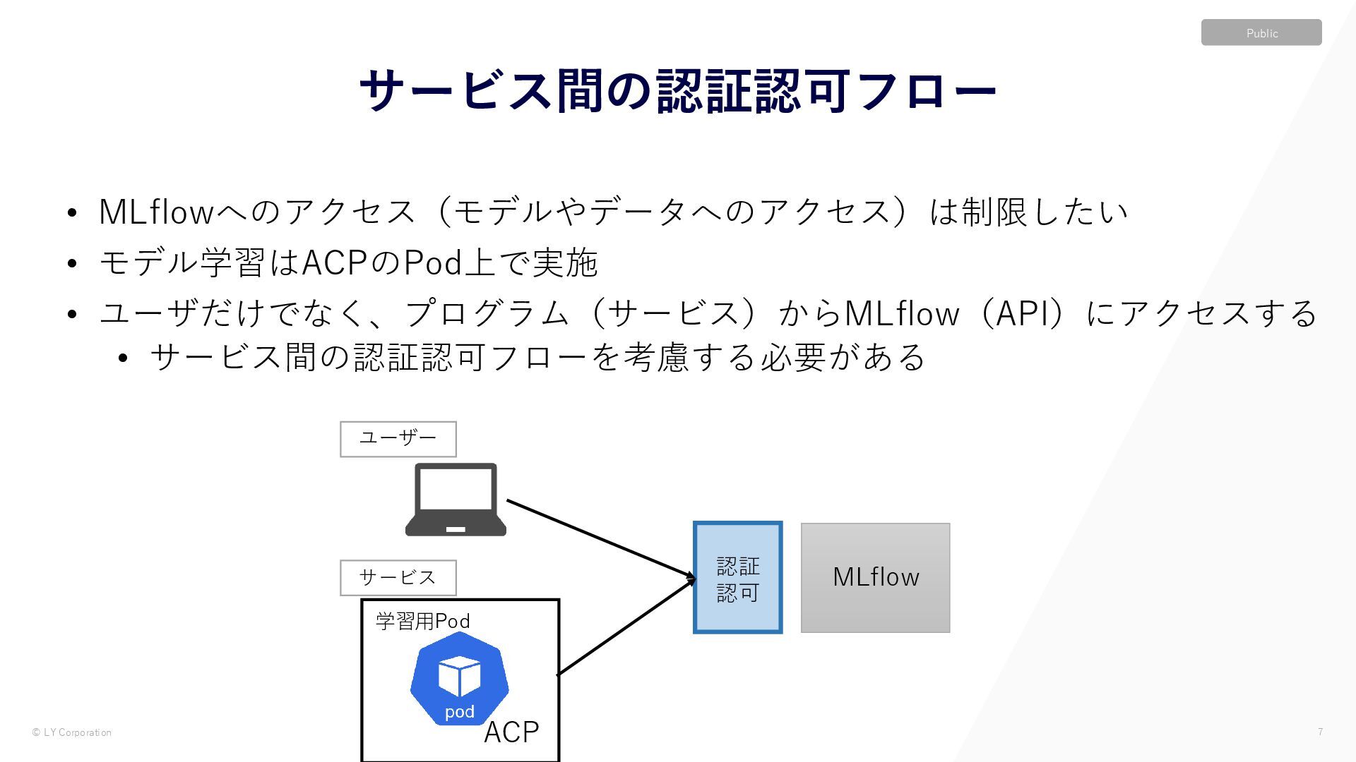 © LY Corporation Public • MLflowへのアクセス(モデルやデータへのアクセス)は制限したい • モデル学習はACPのPod上で実施 • ユーザだけでなく、プログラム(サービス)からMLflow(API)にアクセスする