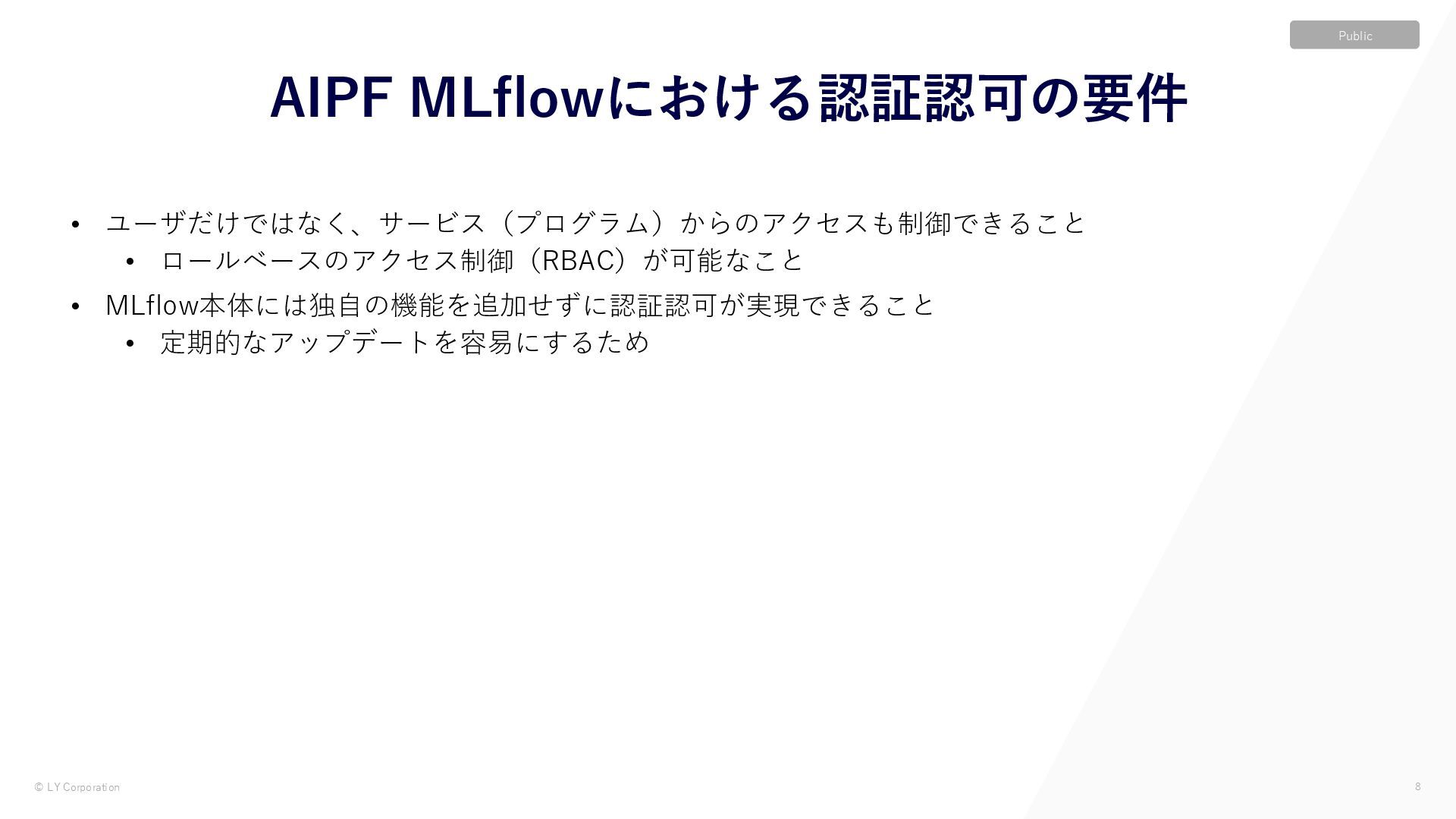 © LY Corporation Public • ユーザだけではなく、サービス(プログラム)からのアクセスも制御できること • ロールベースのアクセス制御(RBAC)が可能なこと • MLflow本体には独自の機能を追加せずに認証認可が実現できること