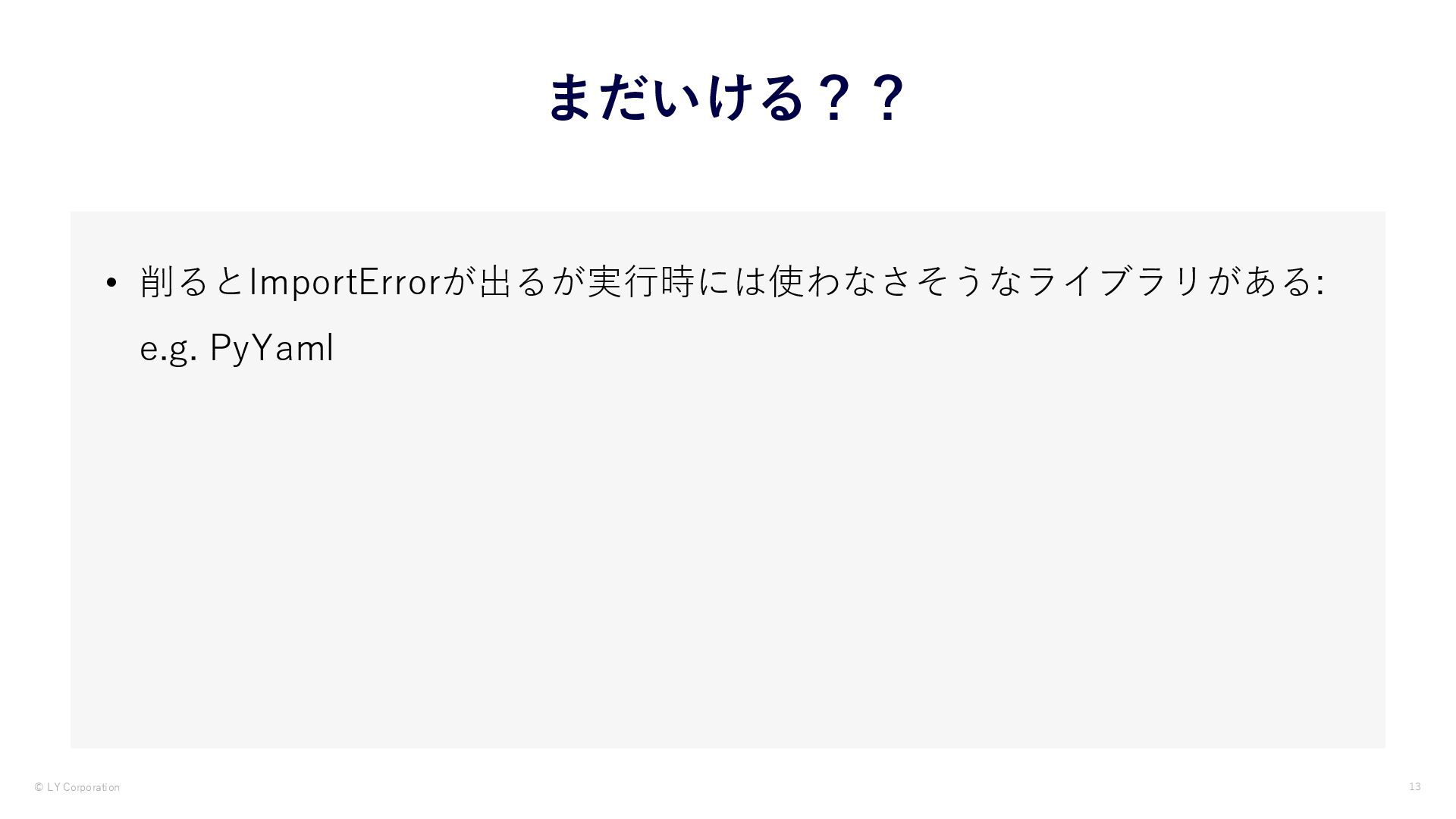 © LY Corporation • 削るとImportErrorが出るが実行時には使わなさそうなライブラリがある: e.g. PyYaml 13 まだいける??