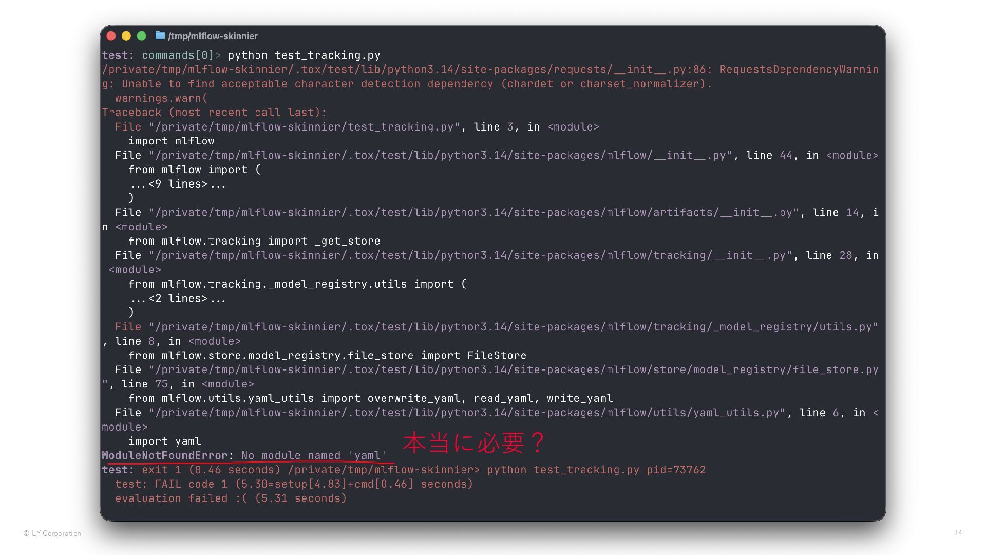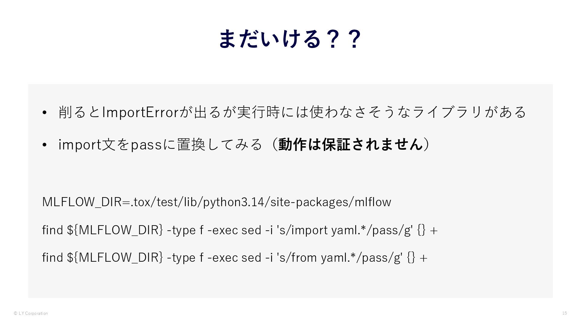© LY Corporation • 削るとImportErrorが出るが実行時には使わなさそうなライブラリがある • import文をpassに置換してみる(動作は保証されません) MLFLOW_DIR=.tox/test/lib/python3.14/site-packages/mlflow find ${MLFLOW_DIR}