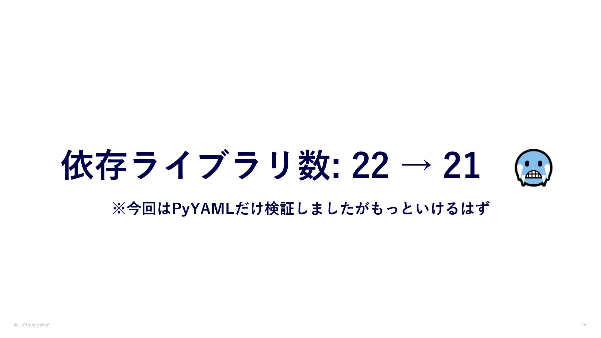 © LY Corporation 16 依存ライブラリ数: 22 → 21 ※今回はPyYAMLだけ検証しましたがもっといけるはず