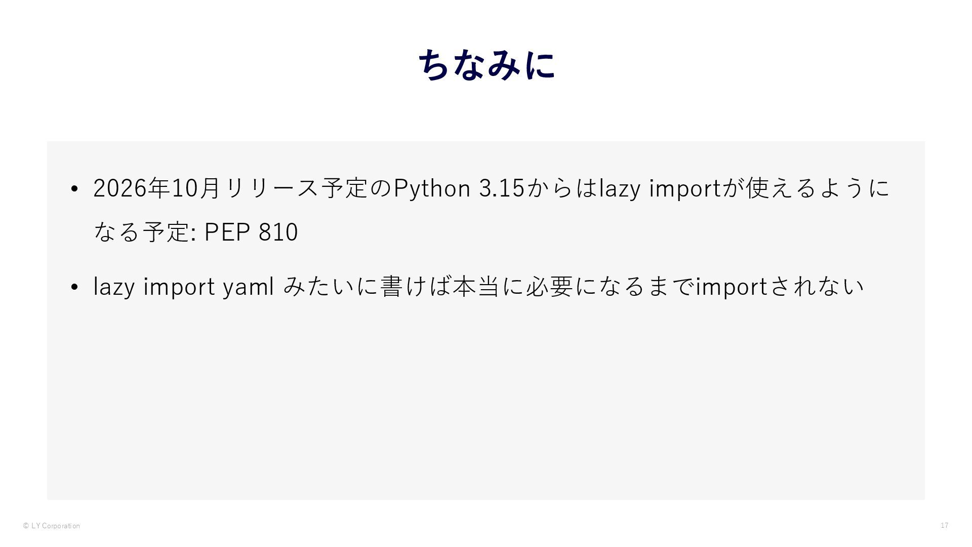 © LY Corporation • 2026年10月リリース予定のPython 3.15からはlazy importが使えるように なる予定: PEP 810